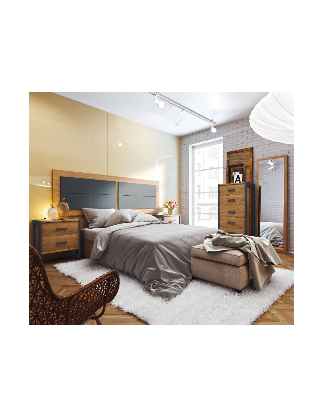 Dormitorio de matrimonio estilo industrial con diferentes acabados patas de forja estructura metalica (2)