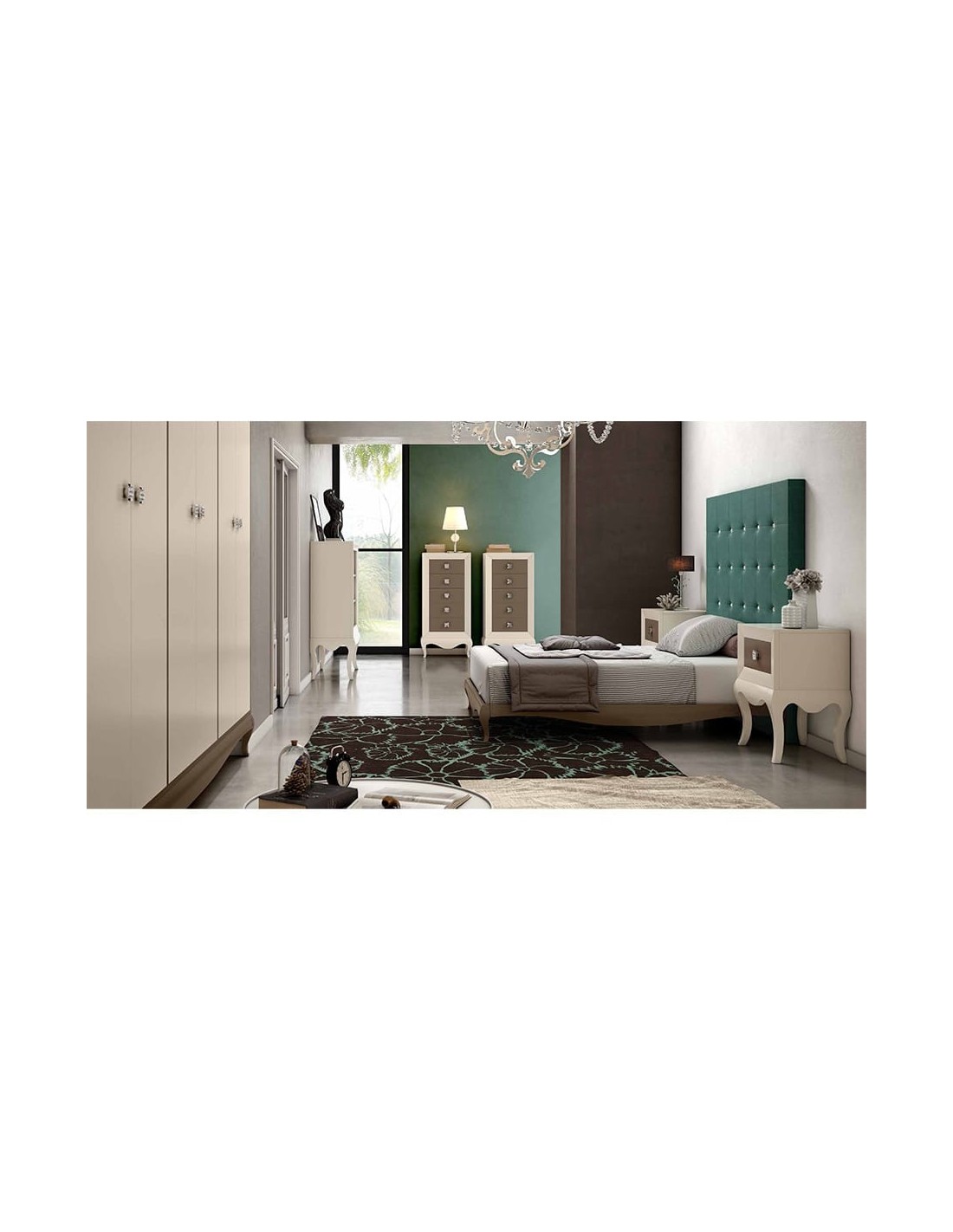 Dormitorio modular estilo romantico con bancada isabelina y cabecero capitone
