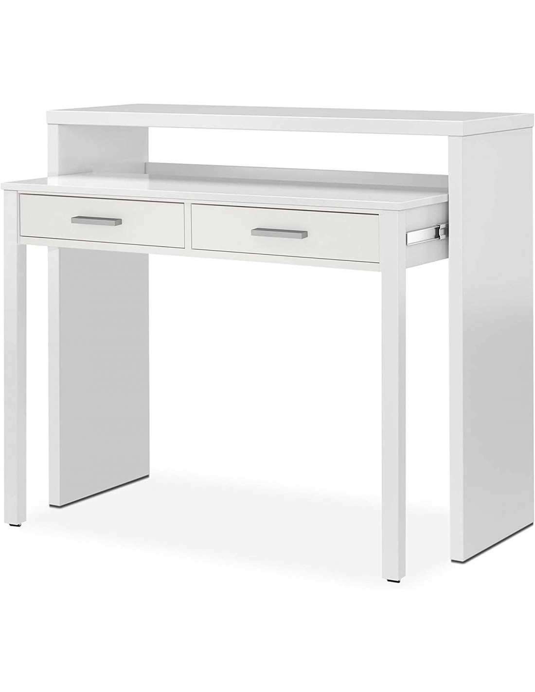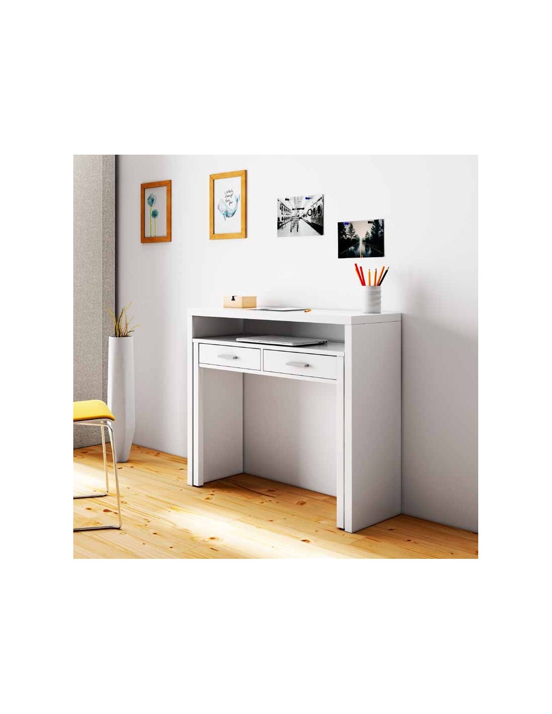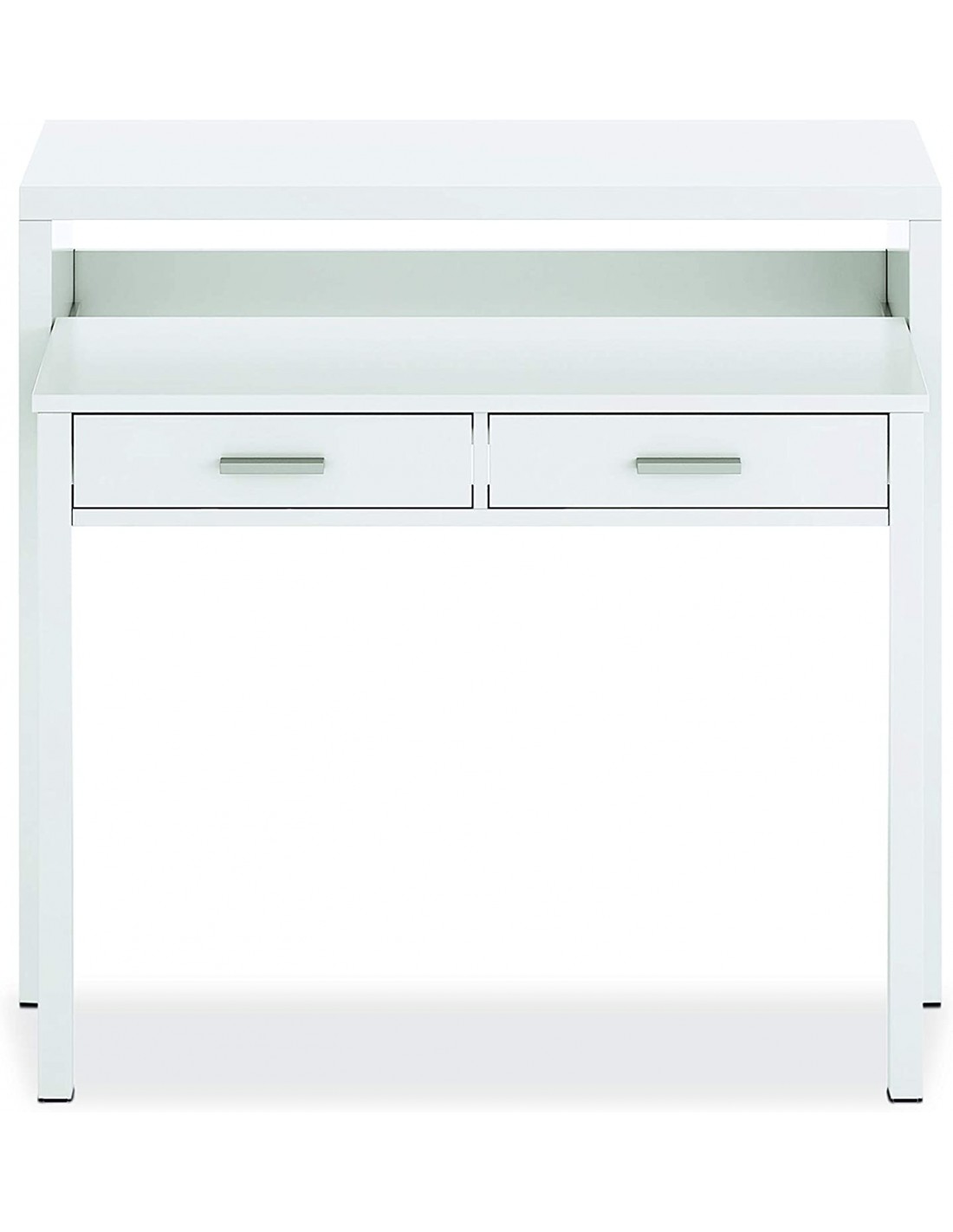 Cerrado es una bonita consola con dos cajones, pero si lo abres se convierte en un práctico y funcional escritorio. Tú decides como lo utilizas. En color blanco Artik para que combine con tu decoración