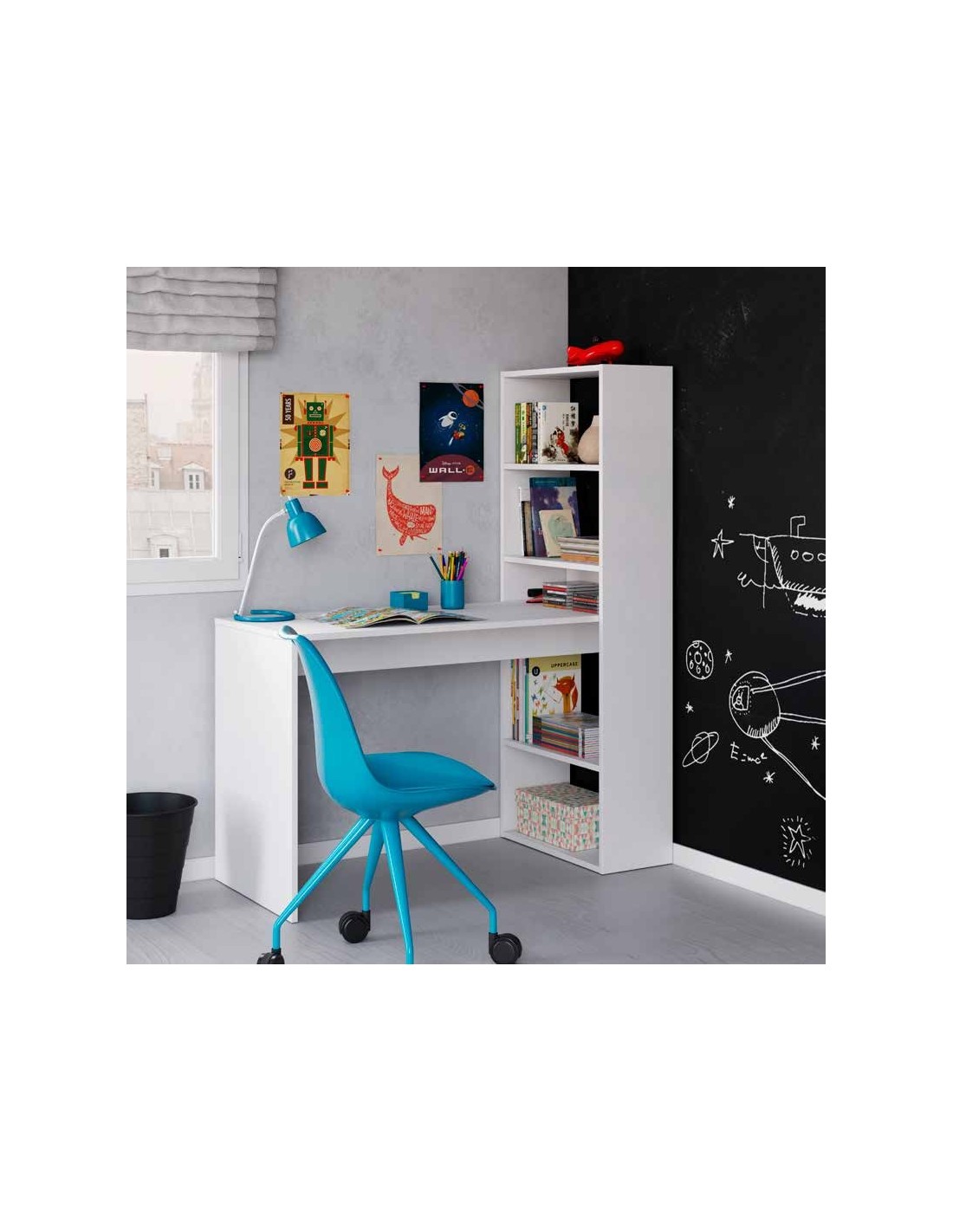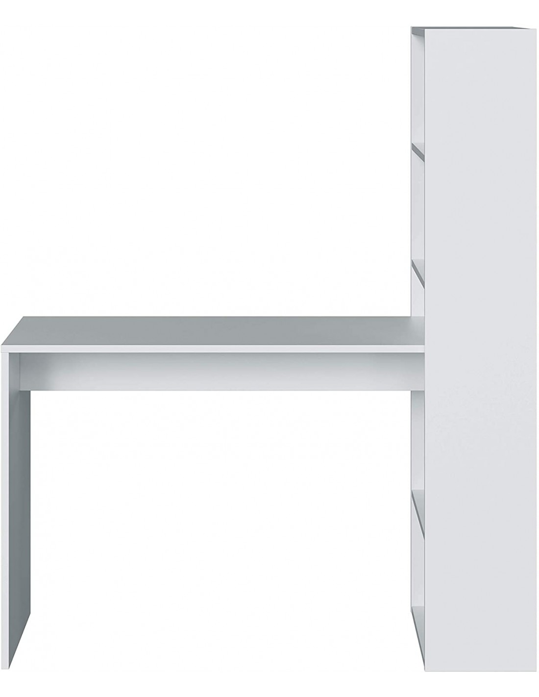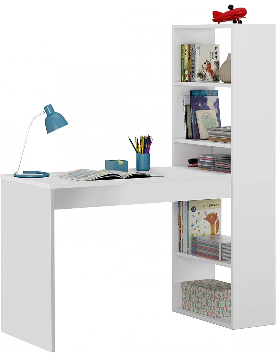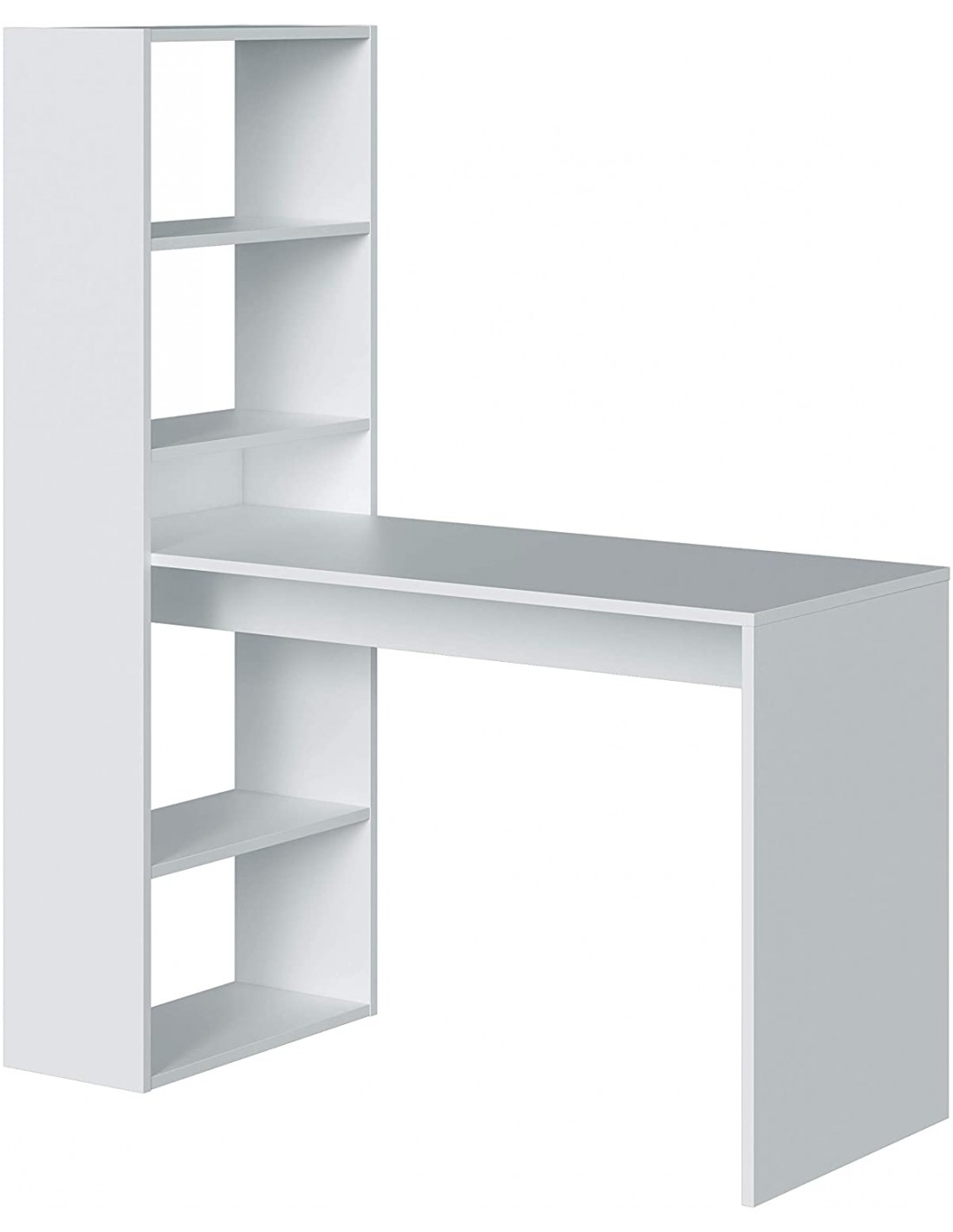 Mesa escritorio reversible con estantería de 5 huecos, fabricado en melaminas de 15 mm de espesor y tacos ABS quitarruidos y antirayas para la parte inferior del mueble.