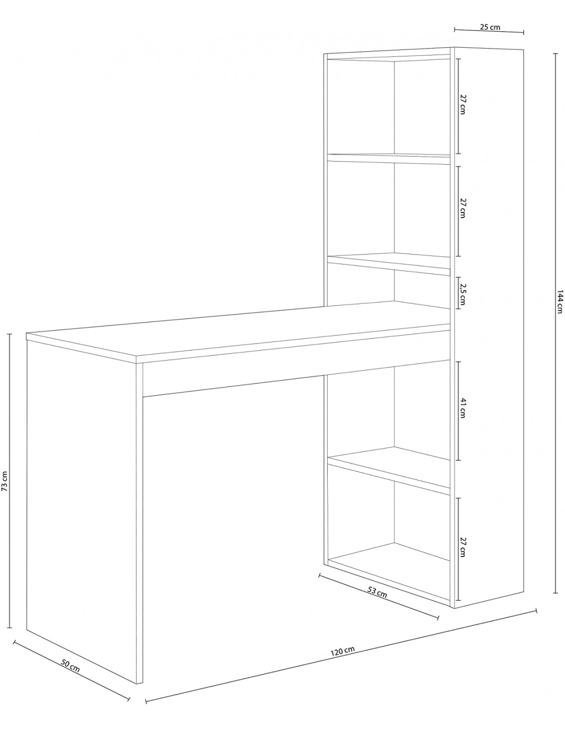 - Las dimensiones del escritorio con la estantería son de: 120 cm de ancho, 144 cm de alto y 53 cm de profundidad.