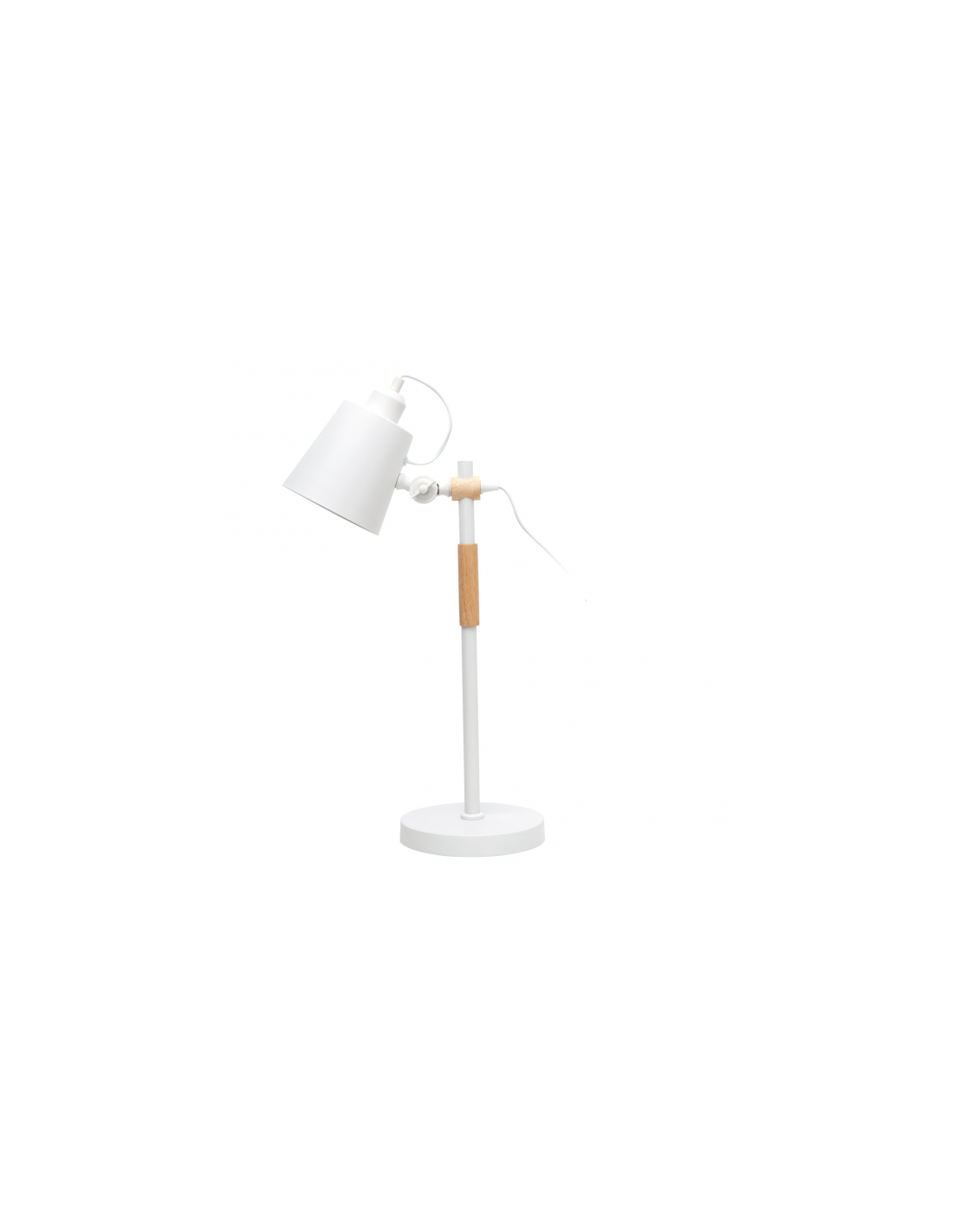 Sobremesa serie BERGEN de estilo nórdico. Realizado en metal lacado de color blanco y madera. Su altura es de 56 cm, con brazo articulable para orientar la luz. Utiliza un portalámparas E27.