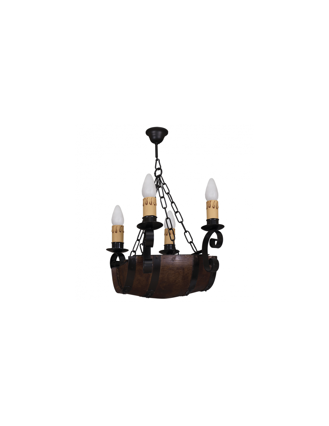 Lámpara de cuatro luces serie Barril de color negro realizado en madera y metal. Destaca por un estilo rústico con cuatro portalámparas E27. Se recomienda el uso de bombillas en forma de vela para potenciar el diseño de la lámpara. Sus dimensiones son, 60X42X32 cm y su peso neto 6090 g.