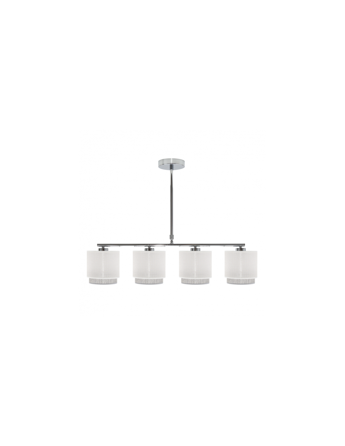 Lámpara serie Kenya en color blanca/gris. Posee un porta lámparas de cuatro luces E14. Su altura es regulable y su diámetro mayor de 50 cm. Puede combinarlo con el colgante de 40 y 50 cm, lámpara de dos y tres luces, sobremesa y pie salón (blanco/gris y gris/blanco).