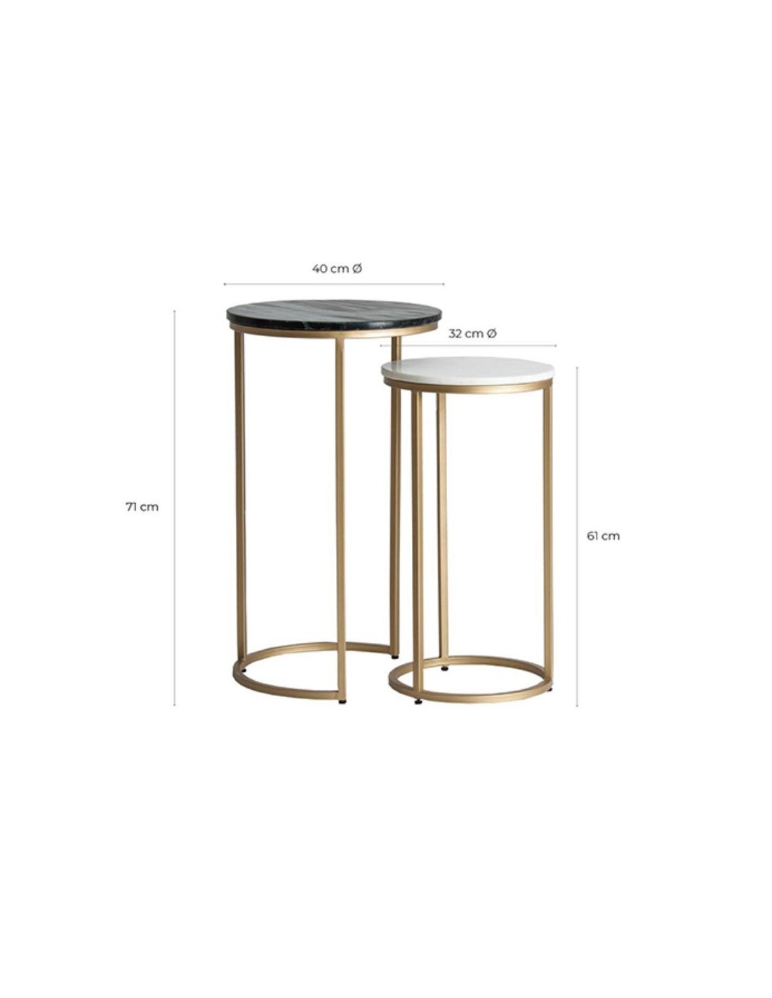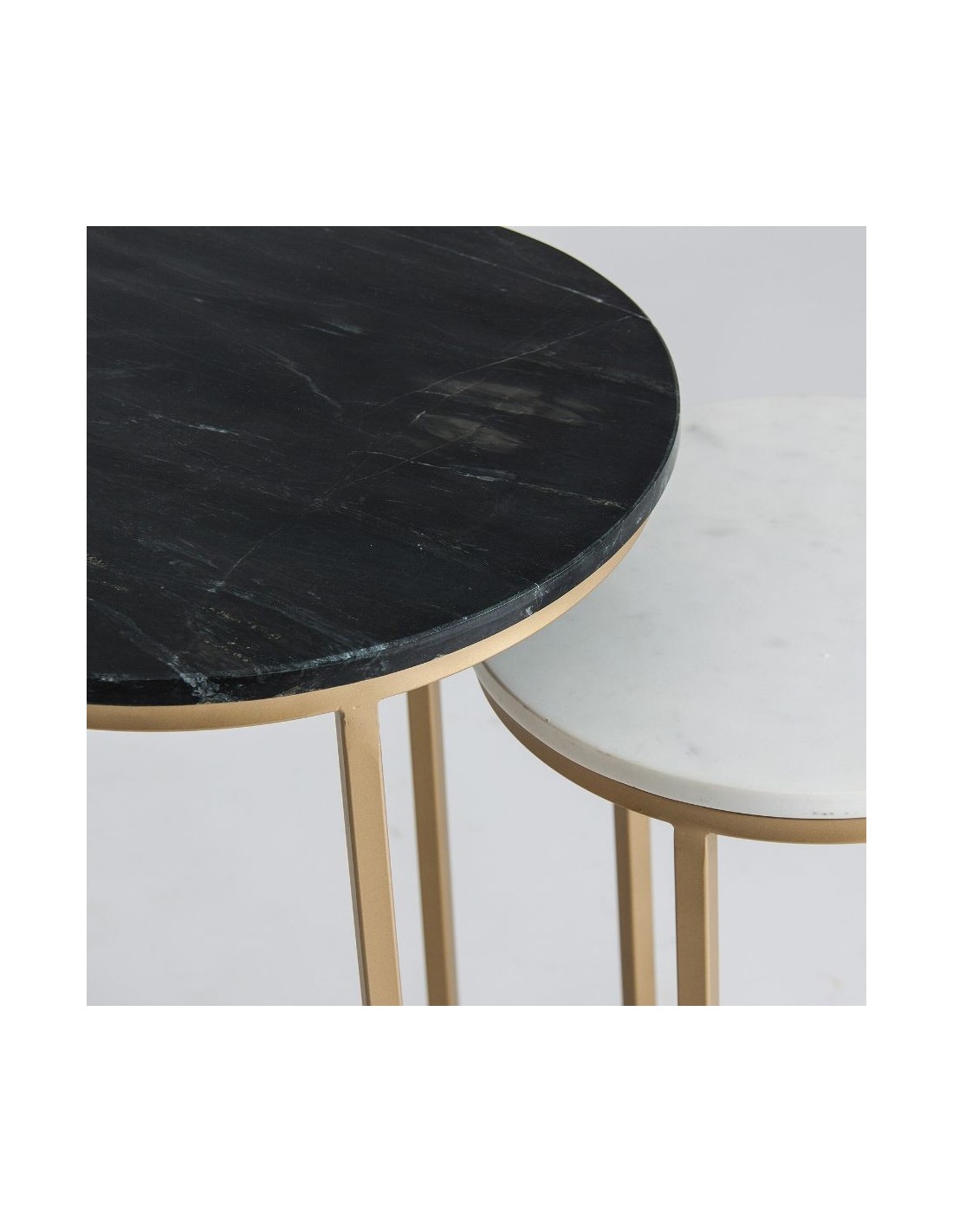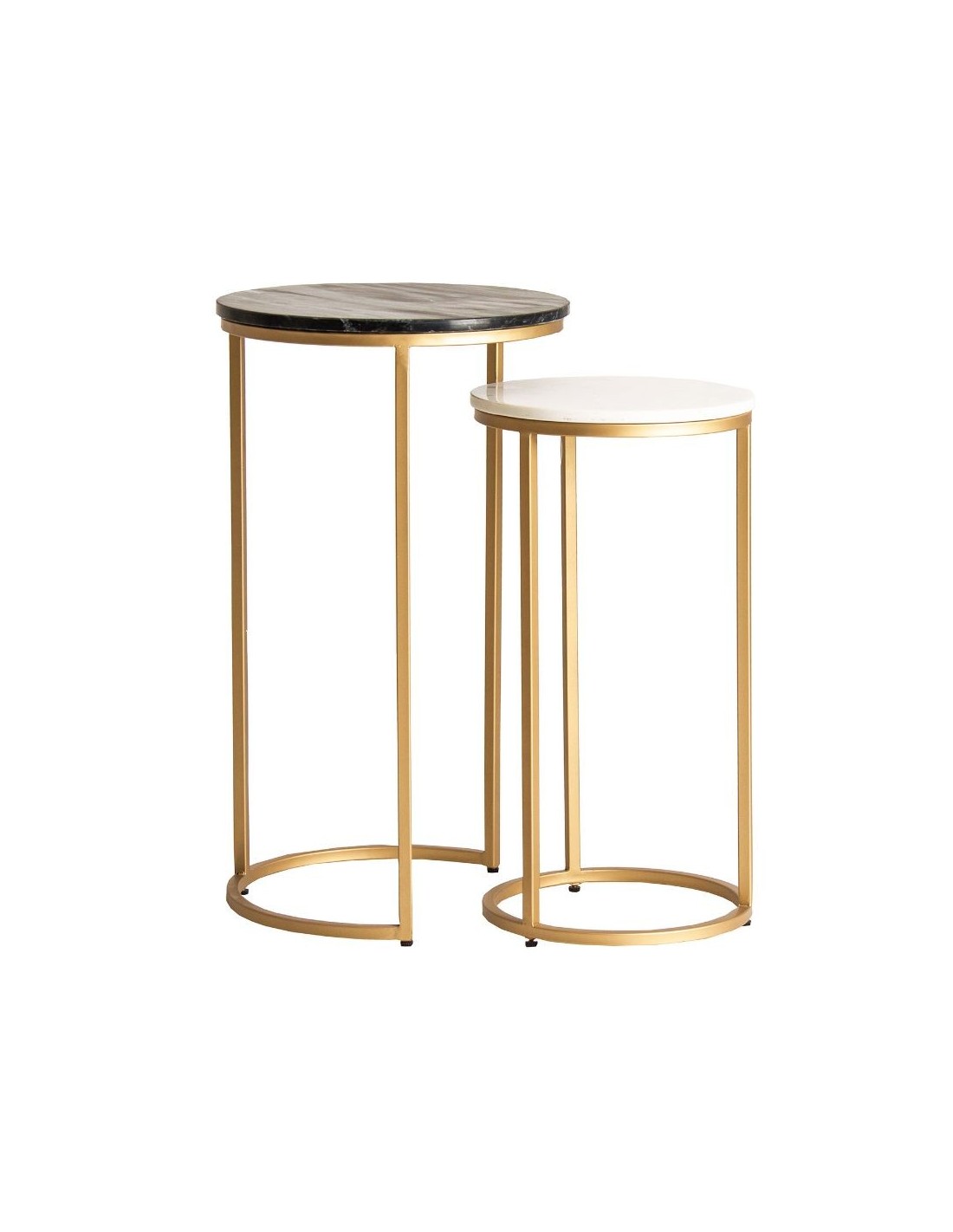 Mesa Auxiliar J/2 Redonda Keinarl, En Color Oro, De Estilo Art Deco. Fabricado En Hierro, Combinado Con Mármol. Mármol Blanco Y Negro.