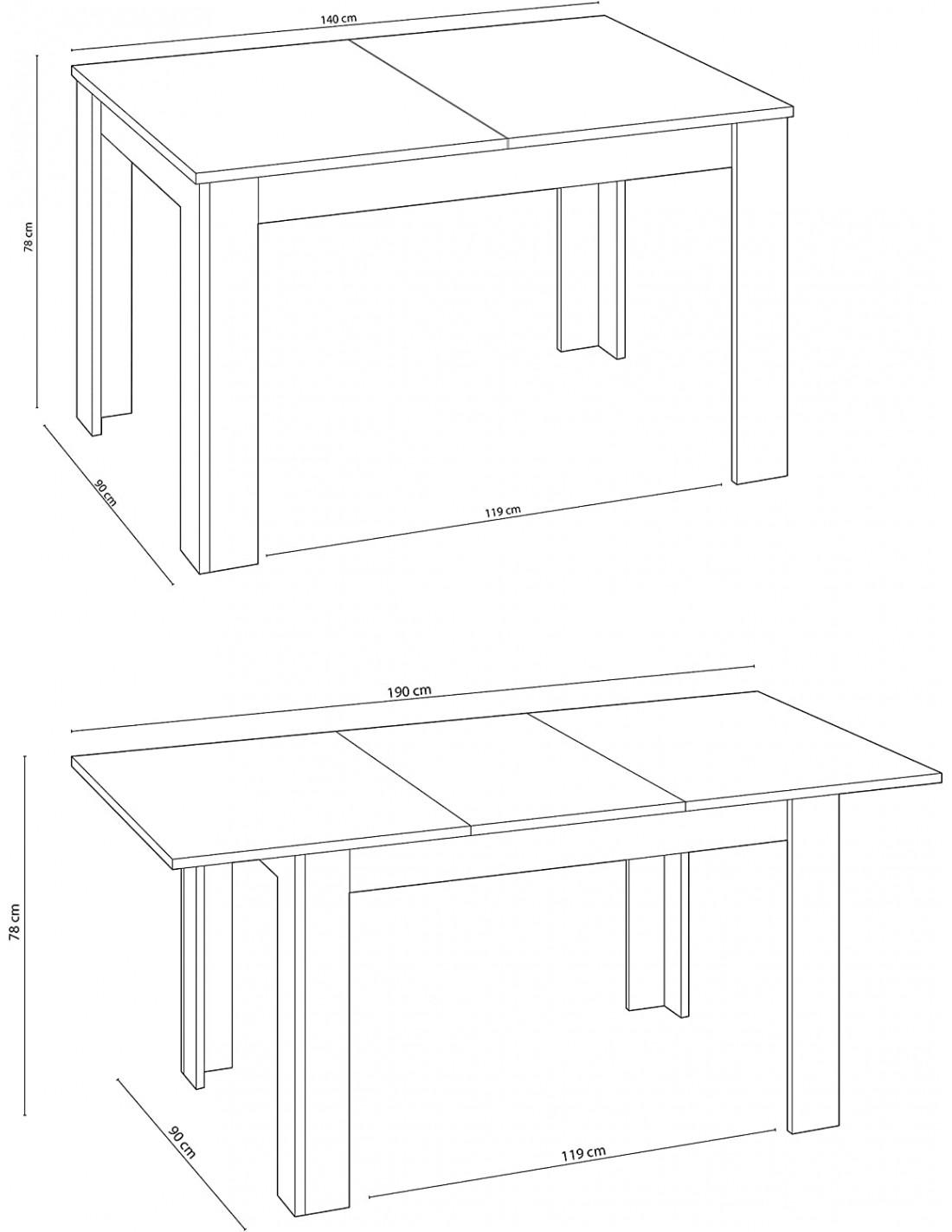 - Mesa abierta: 78 cm (alto) x 190 cm (ancho) x 90 cm (prof.).