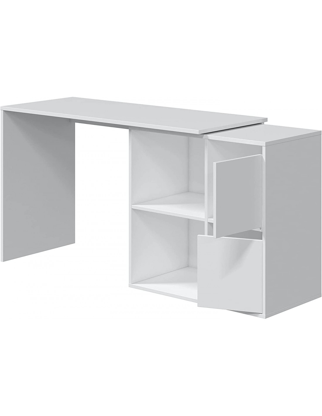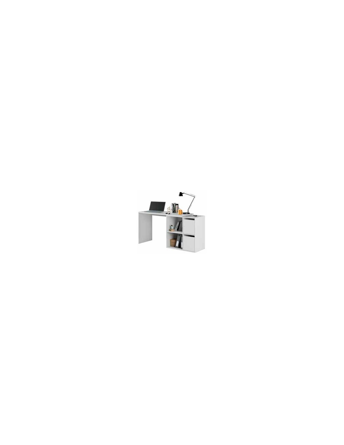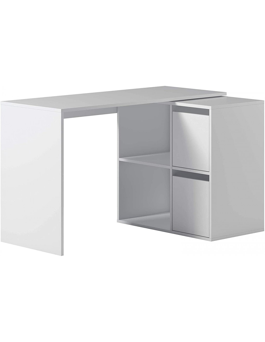Escritorio con buc de 2 puertas y 2 huecos reversible. Posibilidad de que la mesa sea rinconera. Fabricado en melaminas de 15 mm de espesor, con trasera de madera de 3 mm de color blanco.