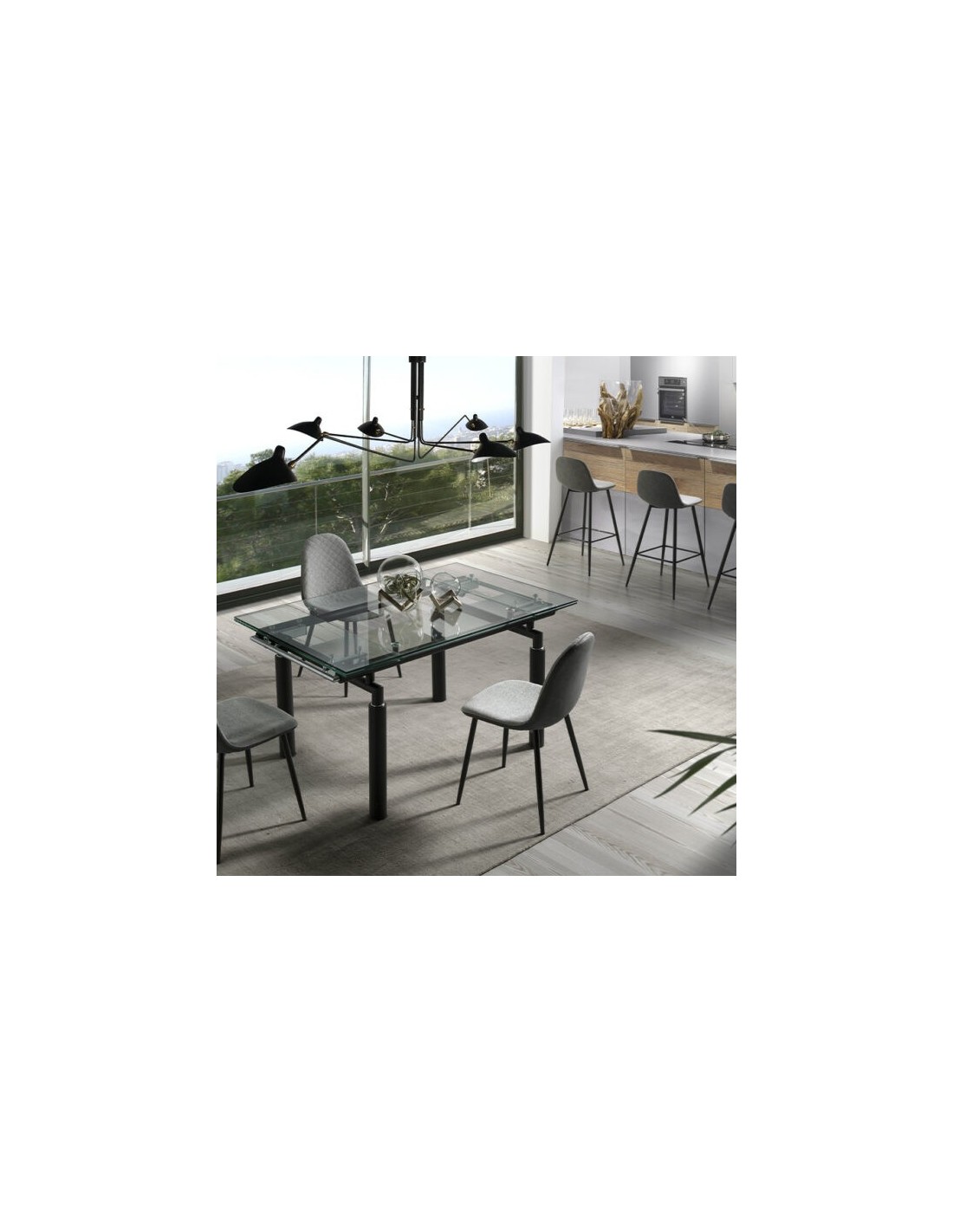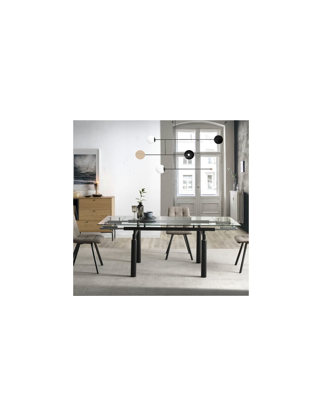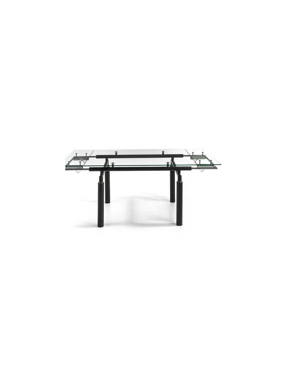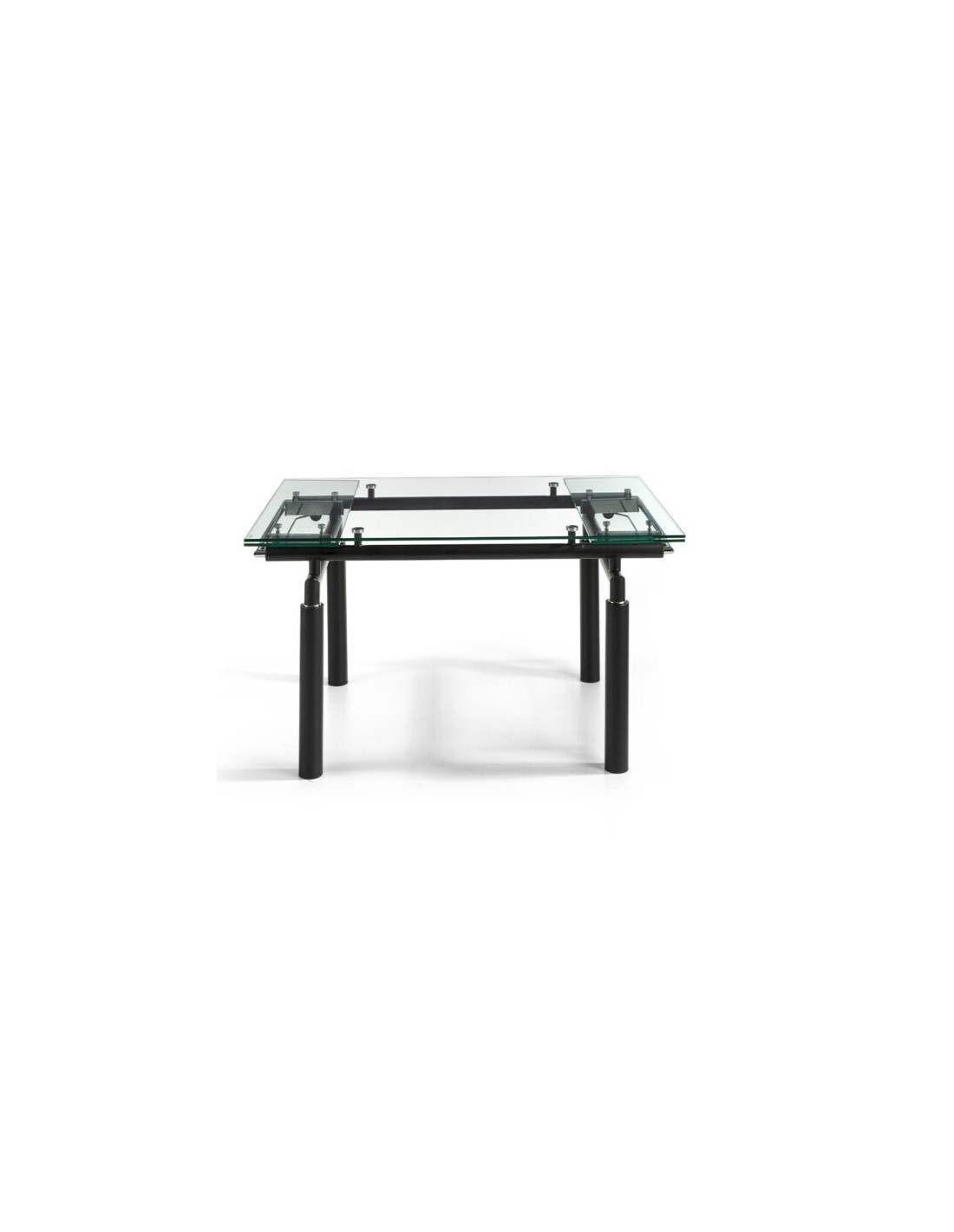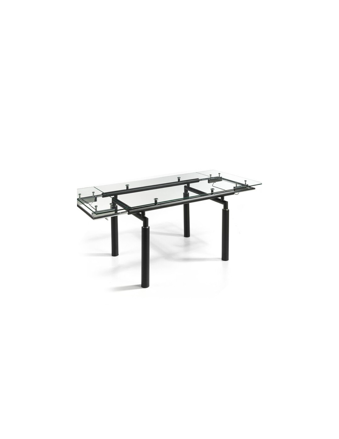 MESA EXTENSIBLE MODELO MODENA Mesa extensible con sobre de vidrio templado transparente de 12 mm y estructura metálica en negro mate. Patas cilíndricas negro mate.