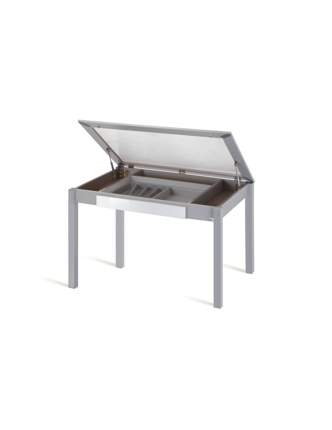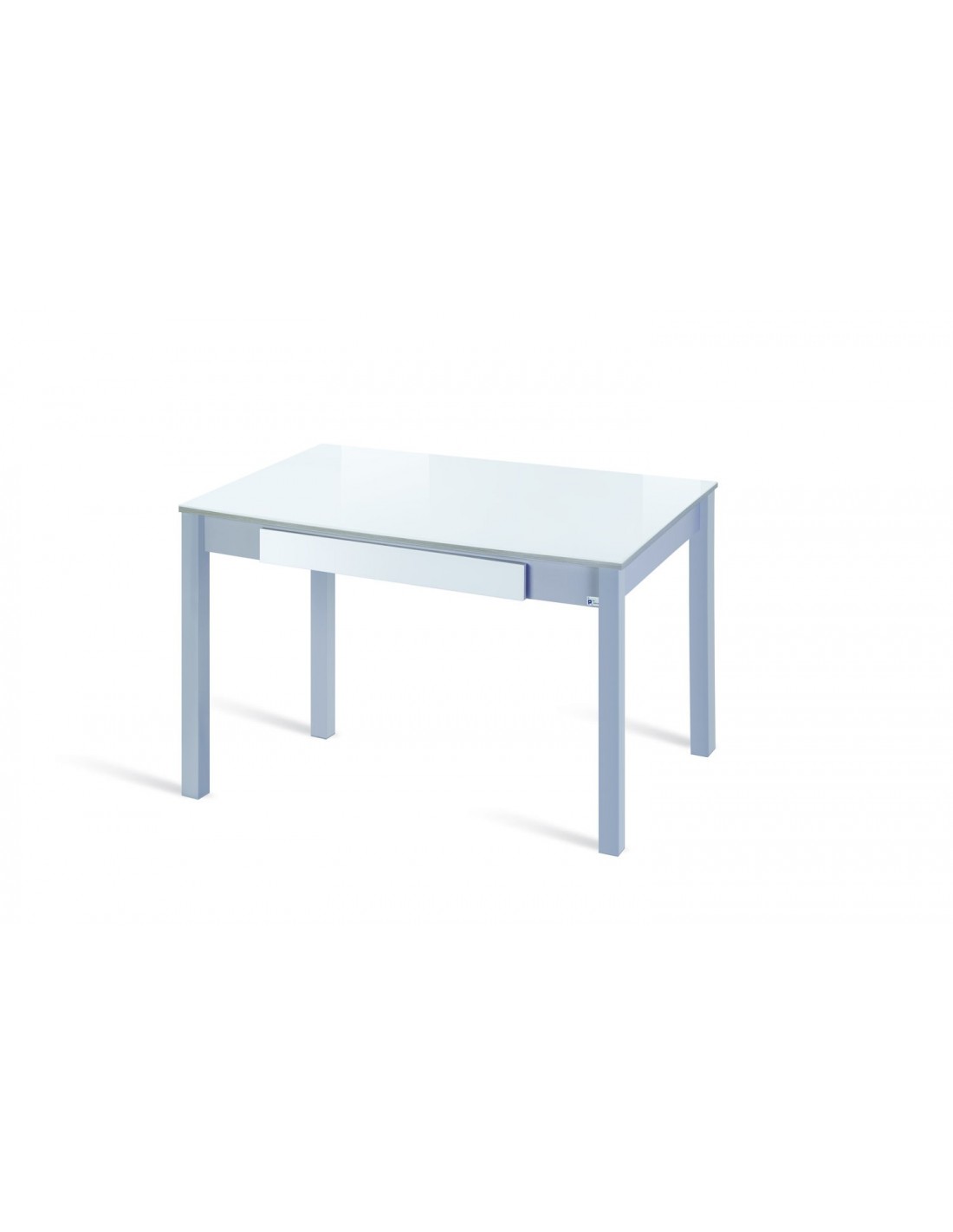 Mesa con tablero de cristal elevable y el cajón doble, todo canteado para proteger de la humedad.