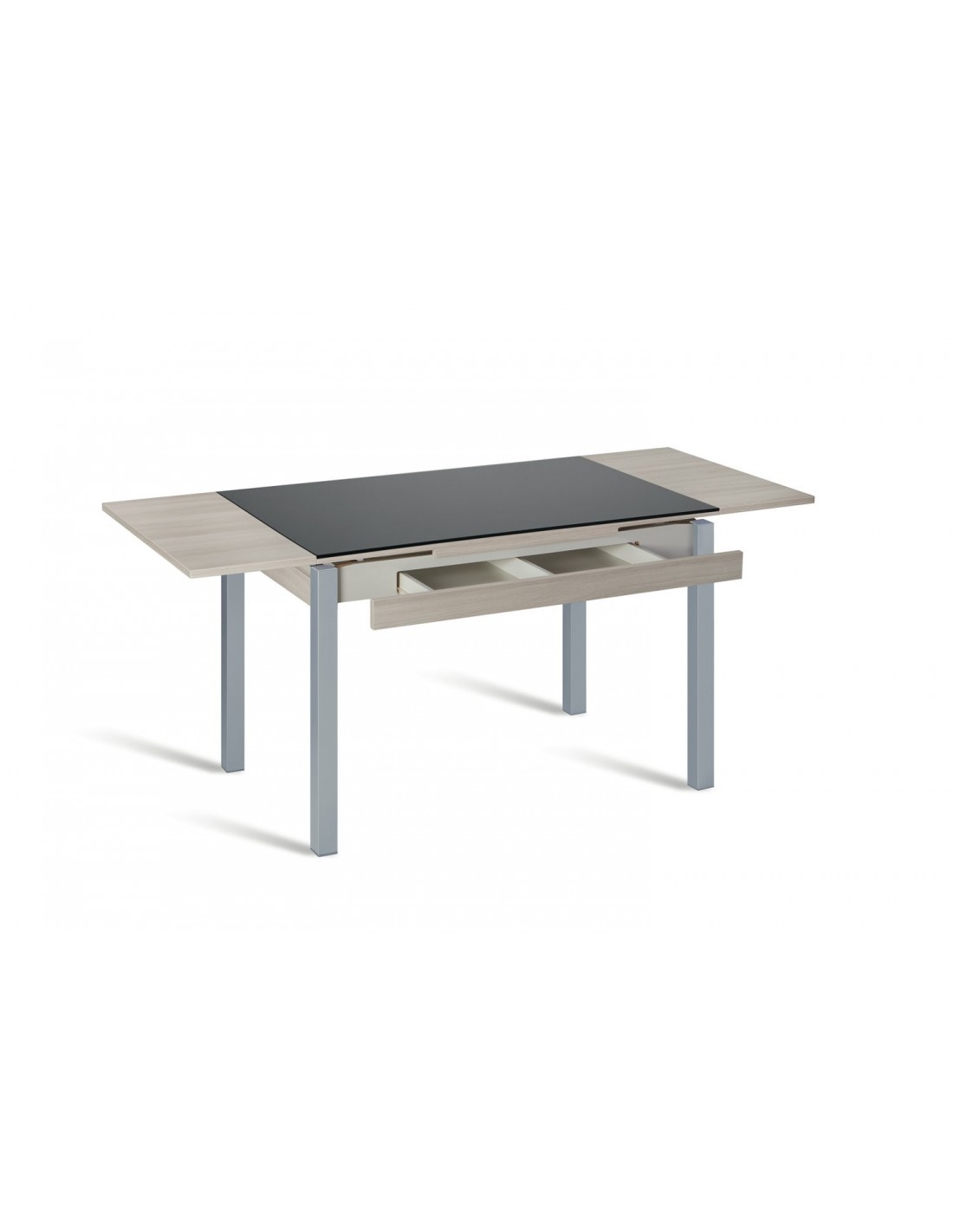 Mesa fija o con dos extensiones y cajón doble.