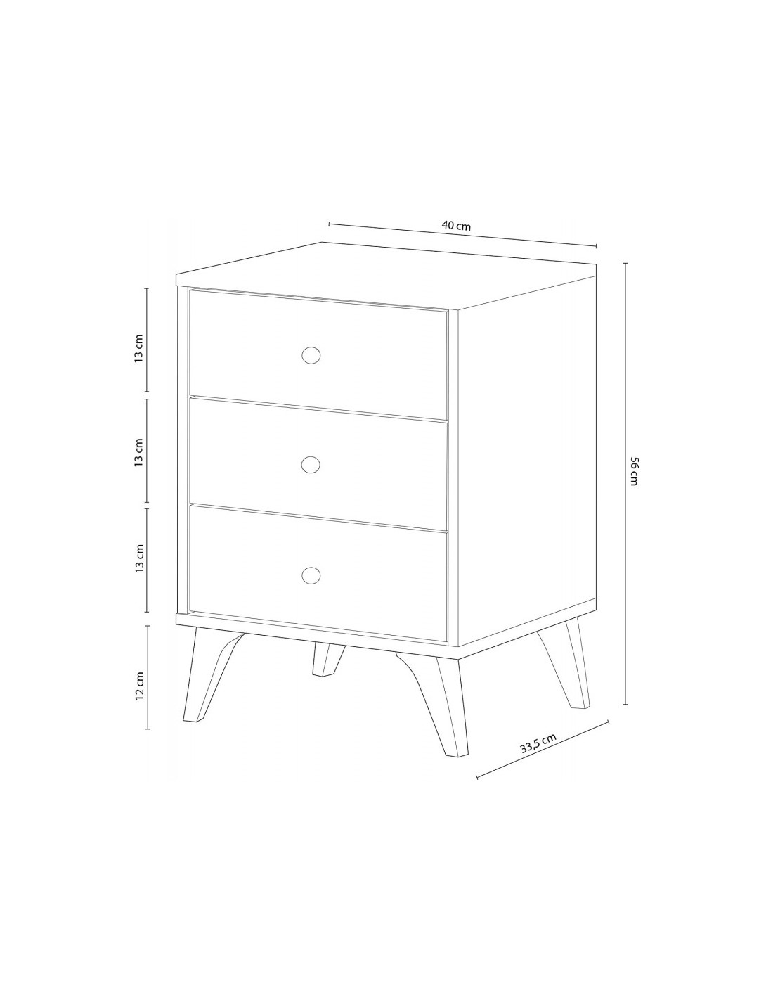 Incluye 3 cajones no extraíbles con guías correderas metálicas, tiradores de bola en ABS pintado del mismo color que el resto del mueble, y 4 patas de estilo nórdico ligeramente inclinadas hacia fuera, también en ABS marrón imitando el look de la madera natural.