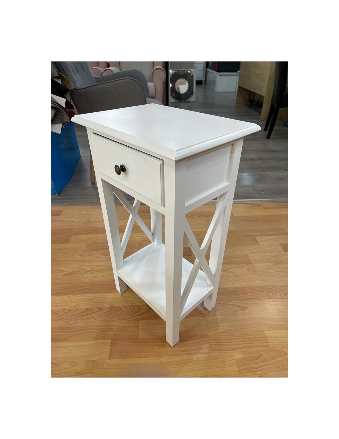 Mesita de noche elegante de color blanco fabricada en madera de gran calidad con un cajón y diseño en X que le da un toque elgante a la vez que refuerza la estructura y mejora la durabilidad.