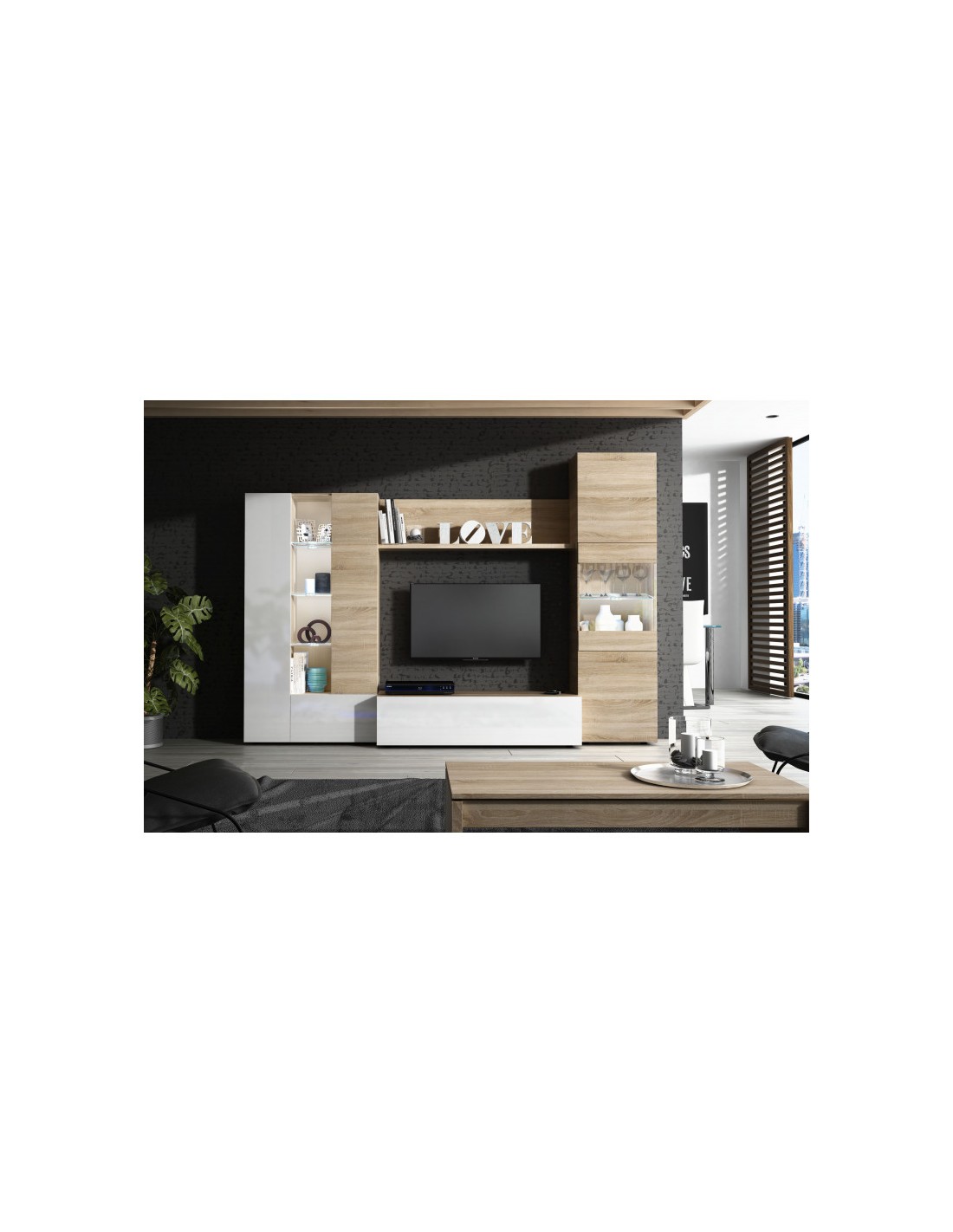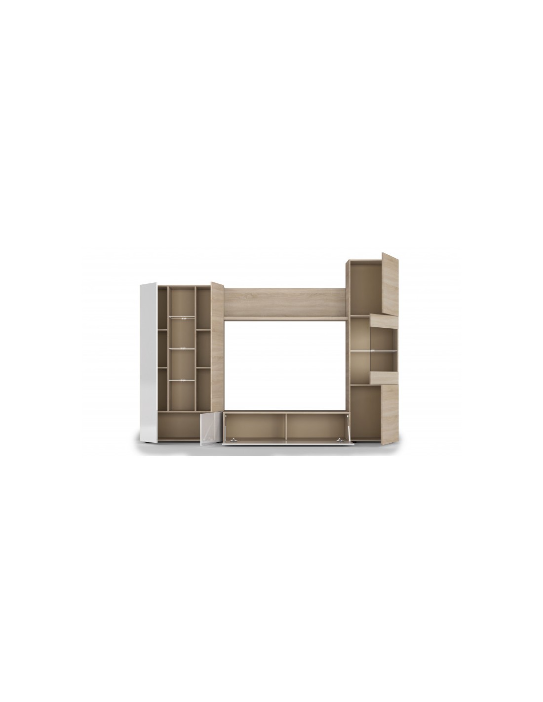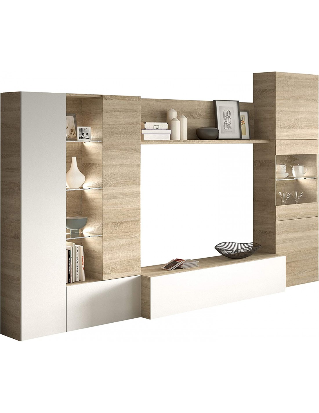 Esta composición de Salón 260 cm , se compone de varios módulos inferiores y laterales que combinan espacios de almacenaje cerrados con puertas con estantes iluminados a la vista, con lo que además de permitirte almacenar objetos