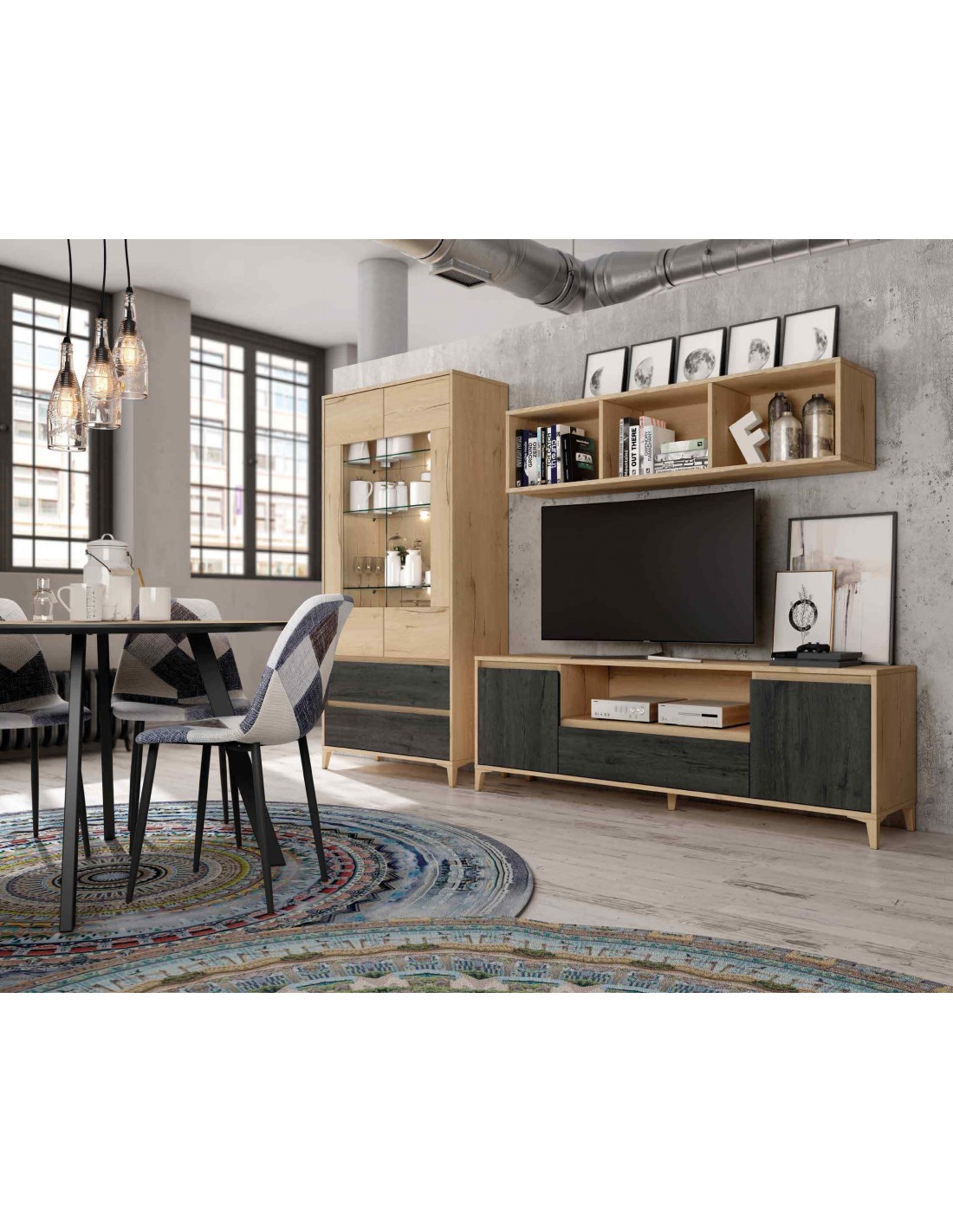 Mueble de salon diseño nordico colores madera modular con vitrinas muebles altos estantes (11)