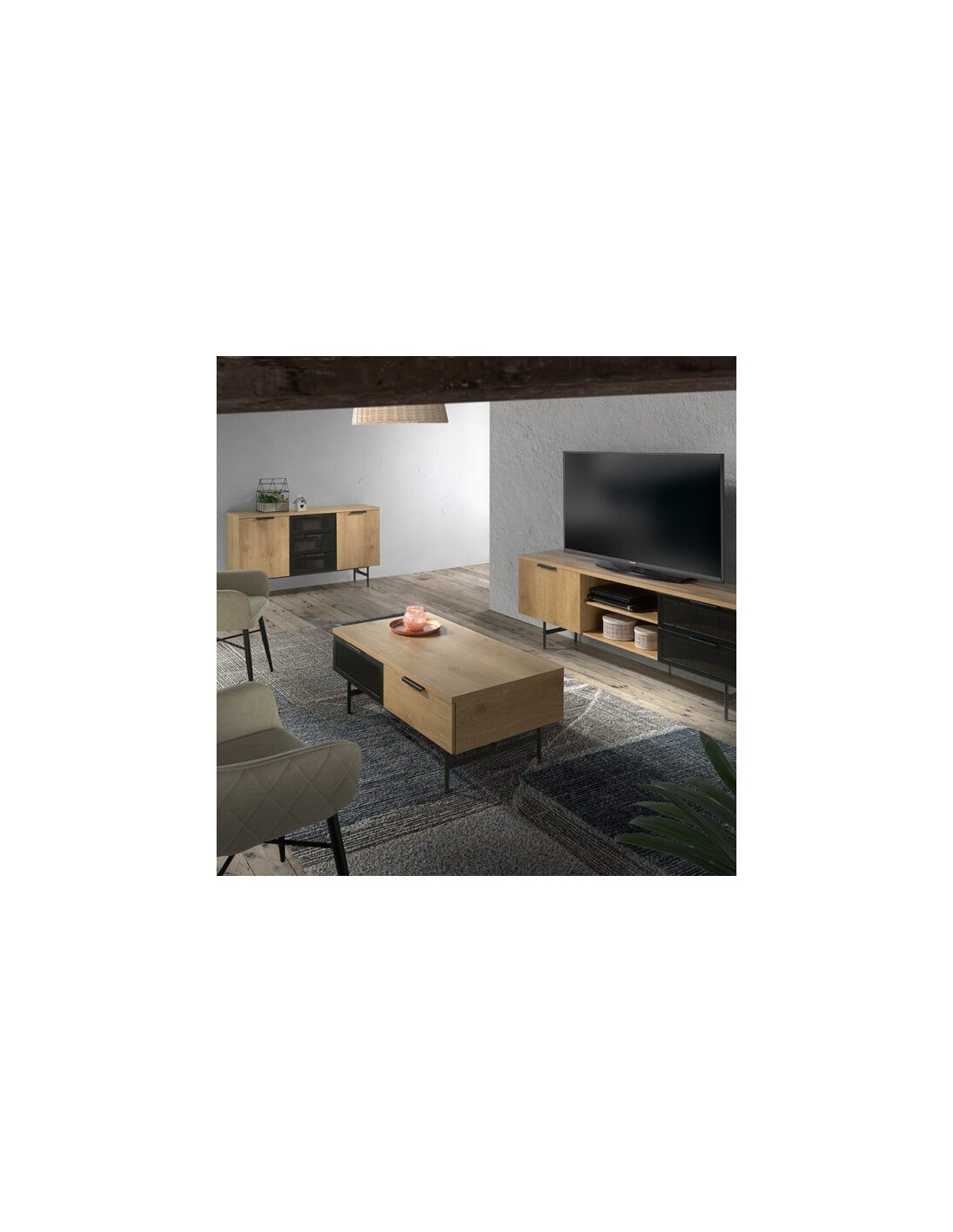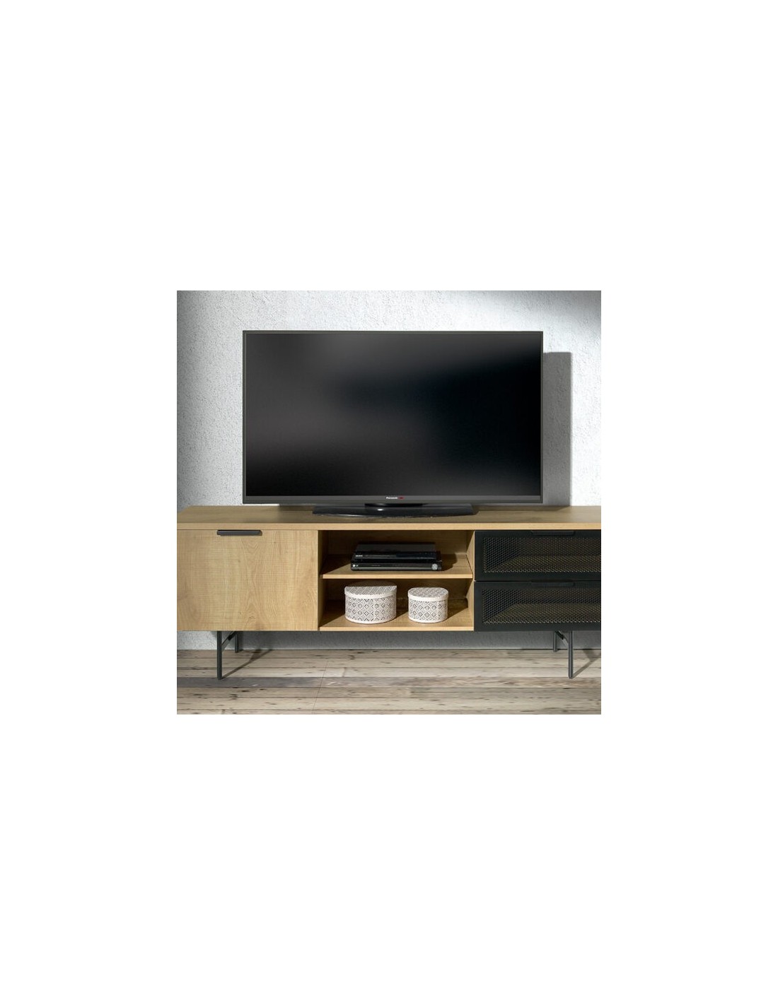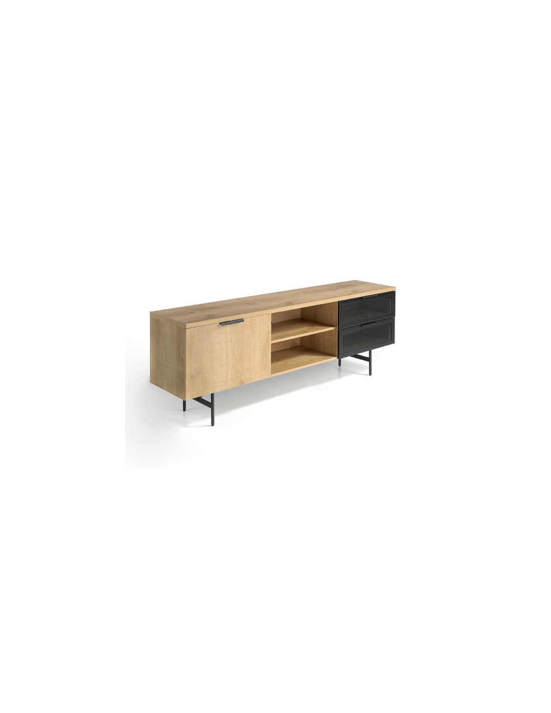 Mueble de TV de una puerta con compartimento y dos cajones de chapa perforada negro mate, acabado melamina en roble. Bonito diseño efecto rústico e industrial con partes de metal negro mate.