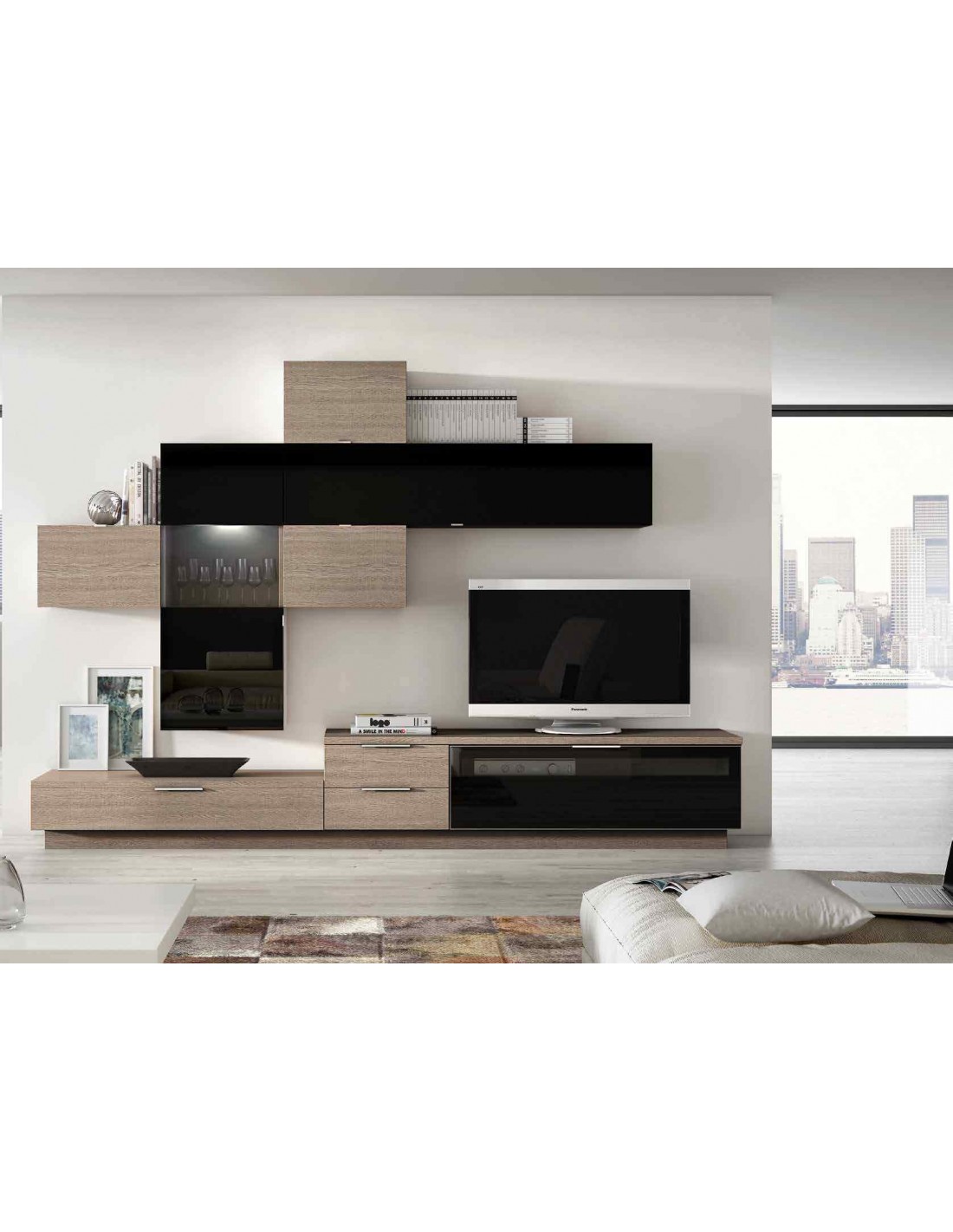 Muebles de salon diseño moderno colgados en la pared formas rectas con cirstales luces led con mesas y aparador (100)