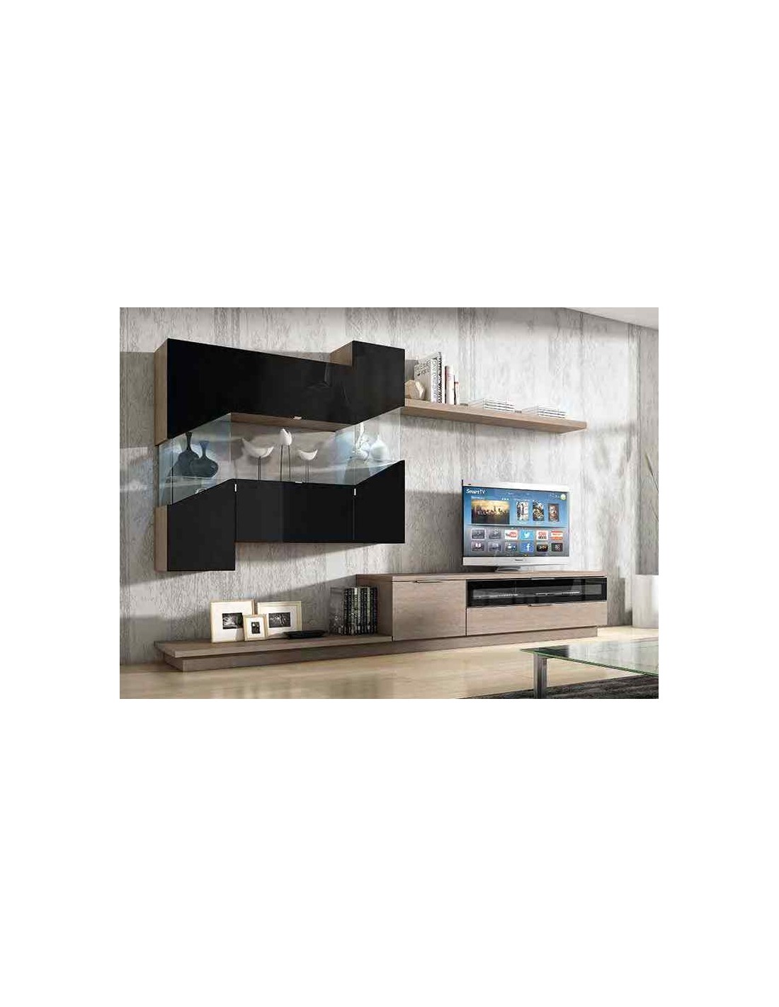 Muebles de salon diseño moderno colgados en la pared formas rectas con cirstales luces led con mesas y aparador (103)