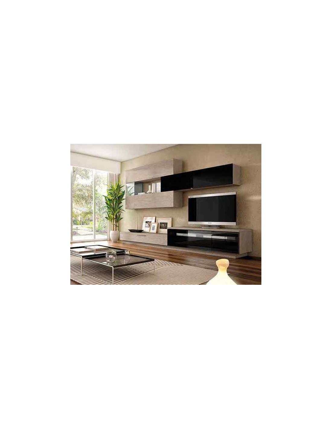 Muebles de salon diseño moderno colgados en la pared formas rectas con cirstales luces led con mesas y aparador (107)