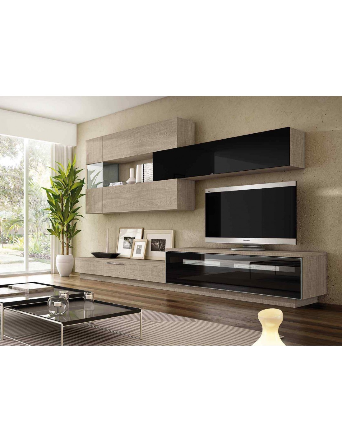 Muebles de salon diseño moderno colgados en la pared formas rectas con cirstales luces led con mesas y aparador (108)