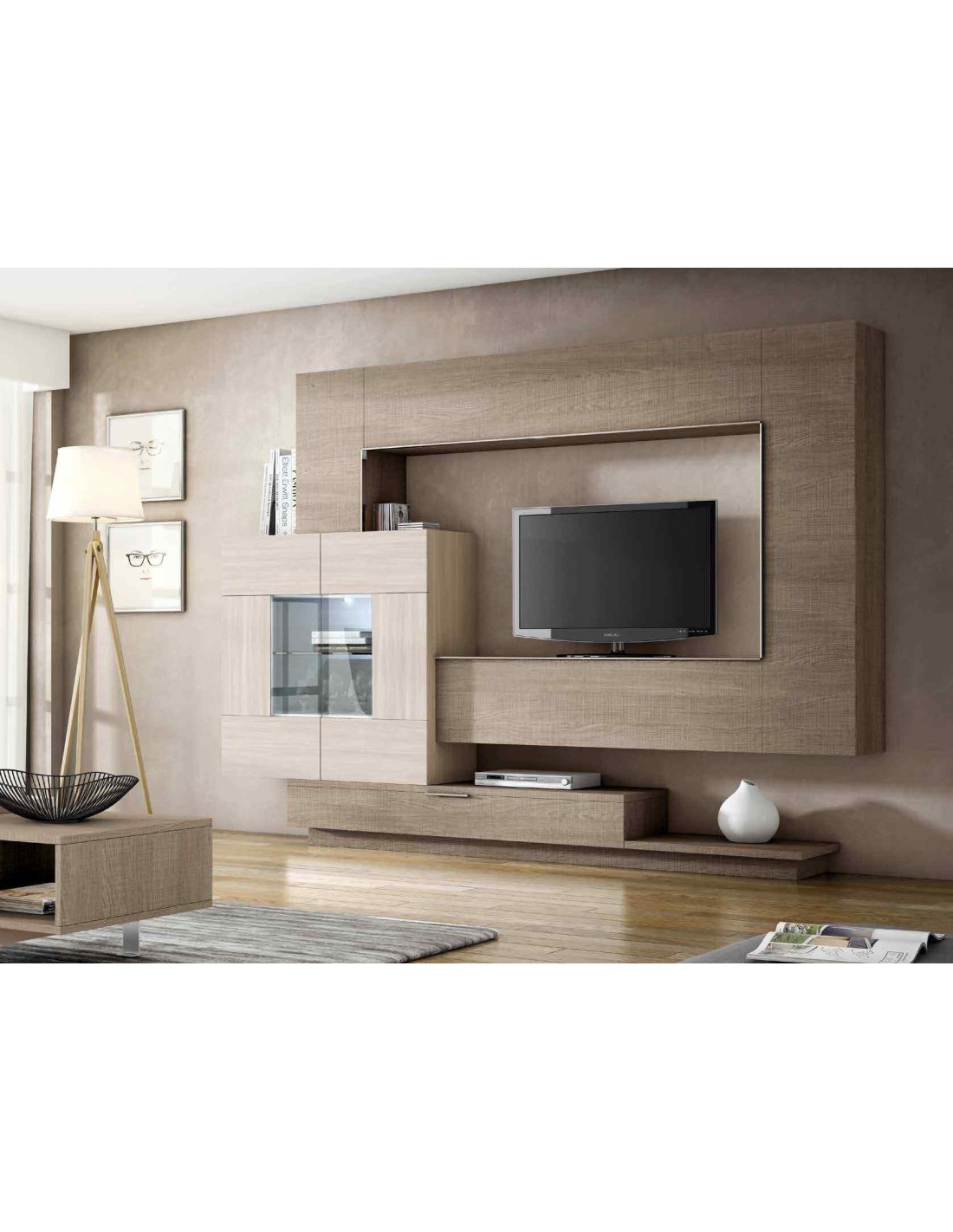 Muebles de salon diseño moderno colgados en la pared formas rectas con cirstales luces led con mesas y aparador (112)