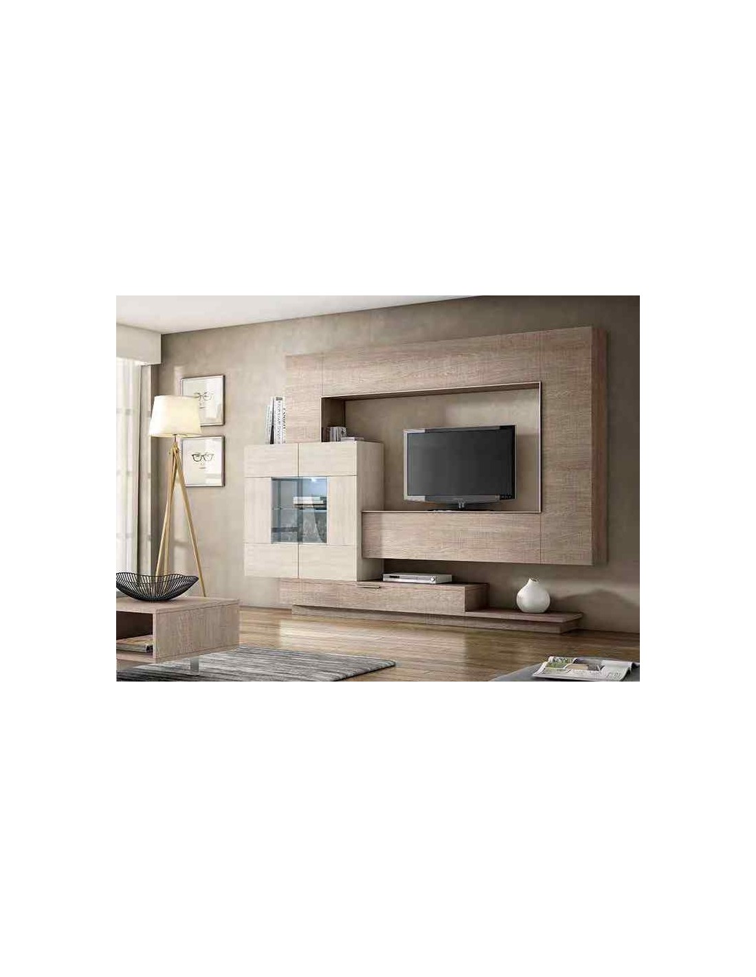 Muebles de salon diseño moderno colgados en la pared formas rectas con cirstales luces led con mesas y aparador (113)