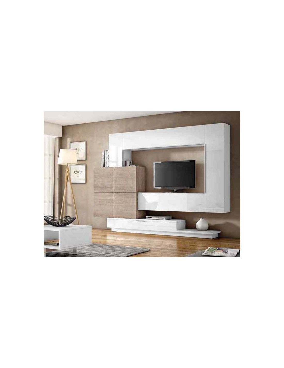 Muebles de salon diseño moderno colgados en la pared formas rectas con cirstales luces led con mesas y aparador (115)