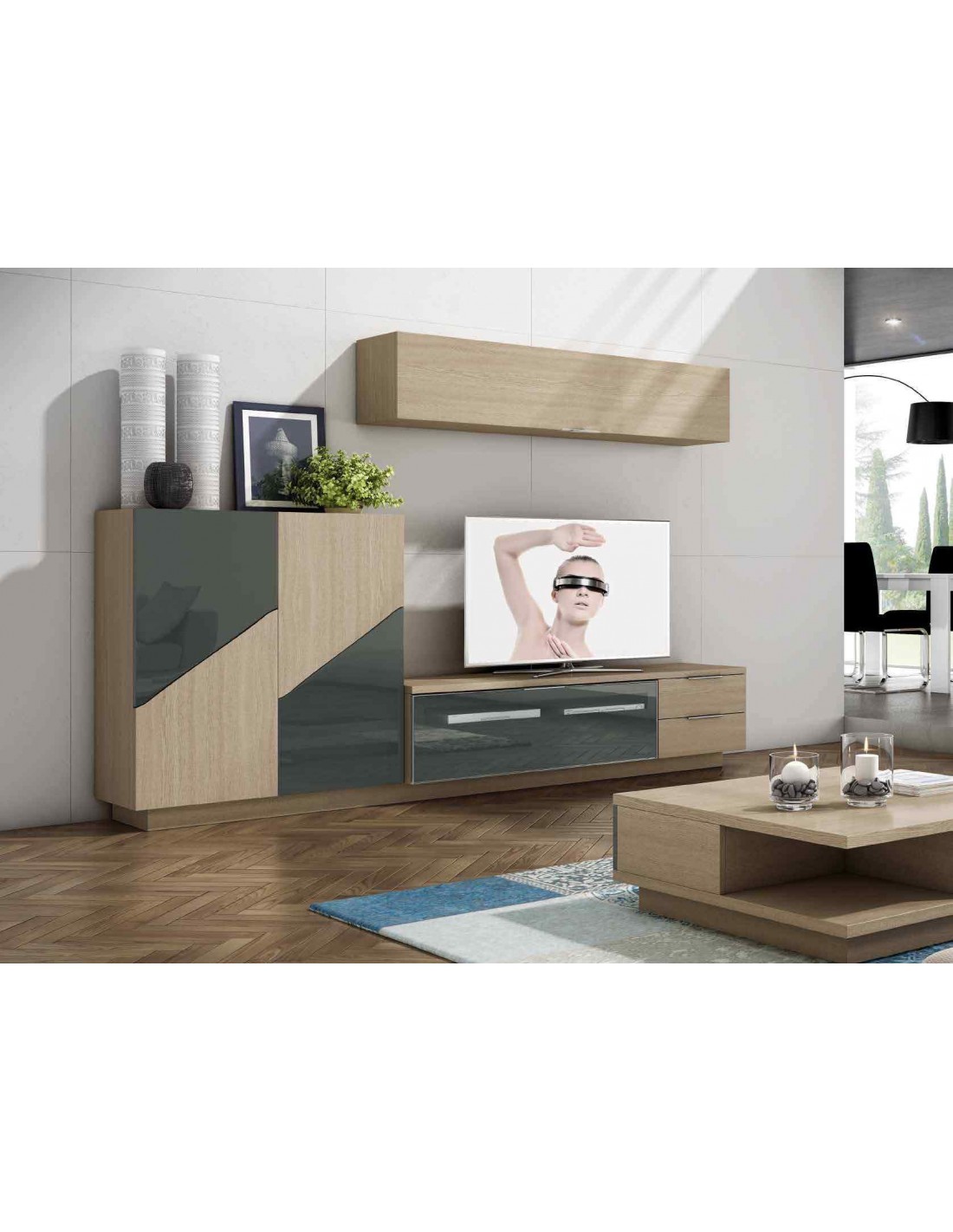 Muebles de salon diseño moderno colgados en la pared formas rectas con cirstales luces led con mesas y aparador (116)