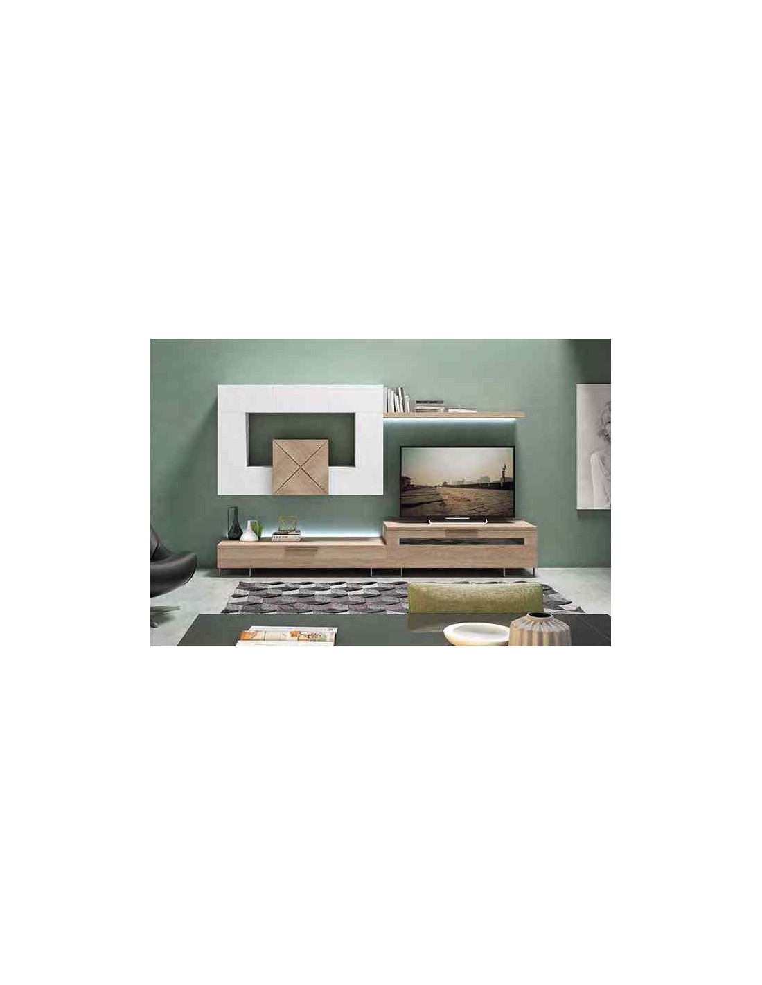 Muebles de salon diseño moderno colgados en la pared formas rectas con cirstales luces led con mesas y aparador (121)