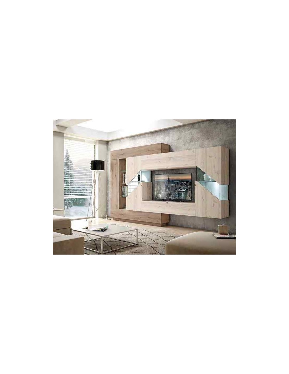 Muebles de salon diseño moderno colgados en la pared formas rectas con cirstales luces led con mesas y aparador (127)
