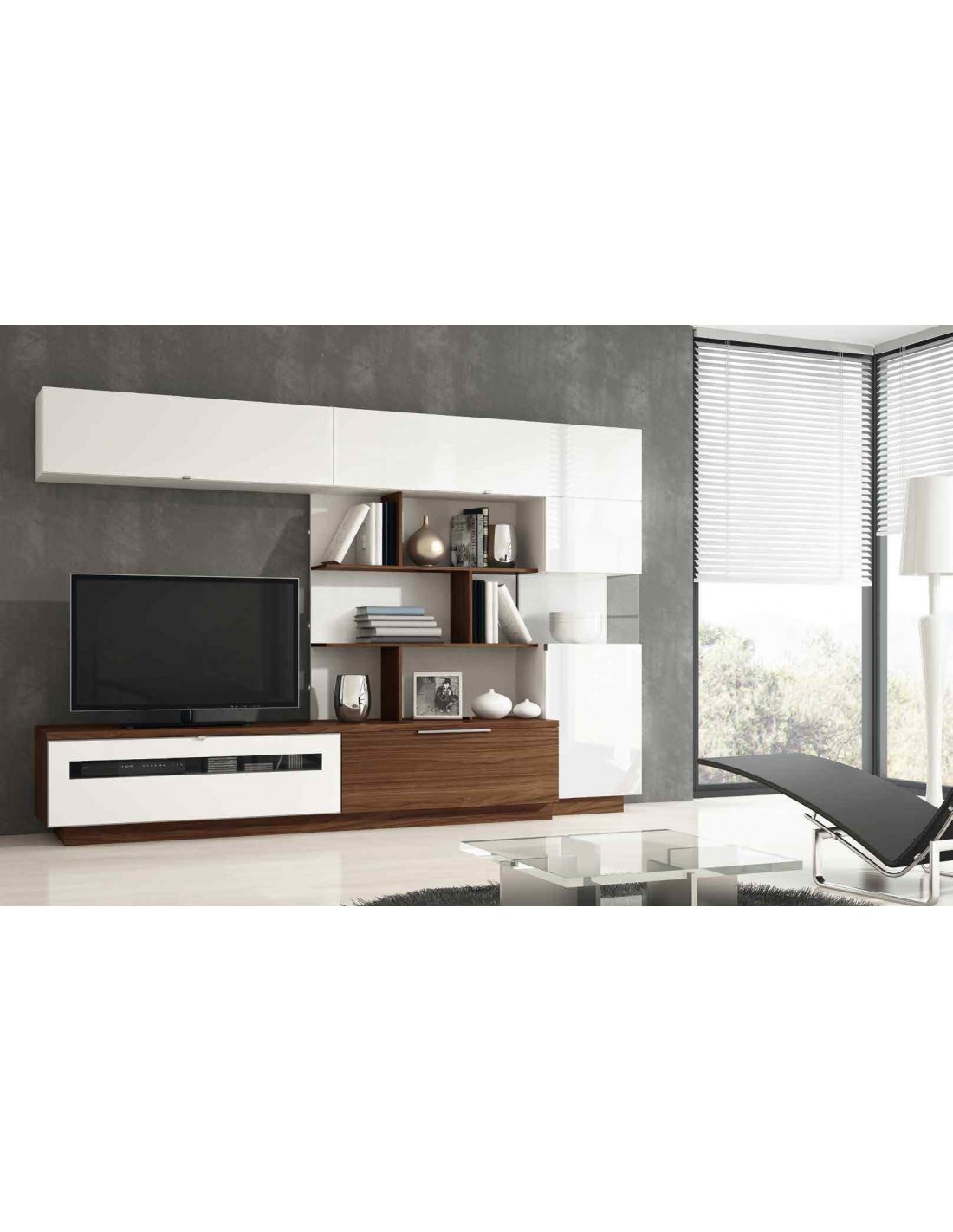 Muebles de salon diseño moderno colgados en la pared formas rectas con cirstales luces led con mesas y aparador (130)