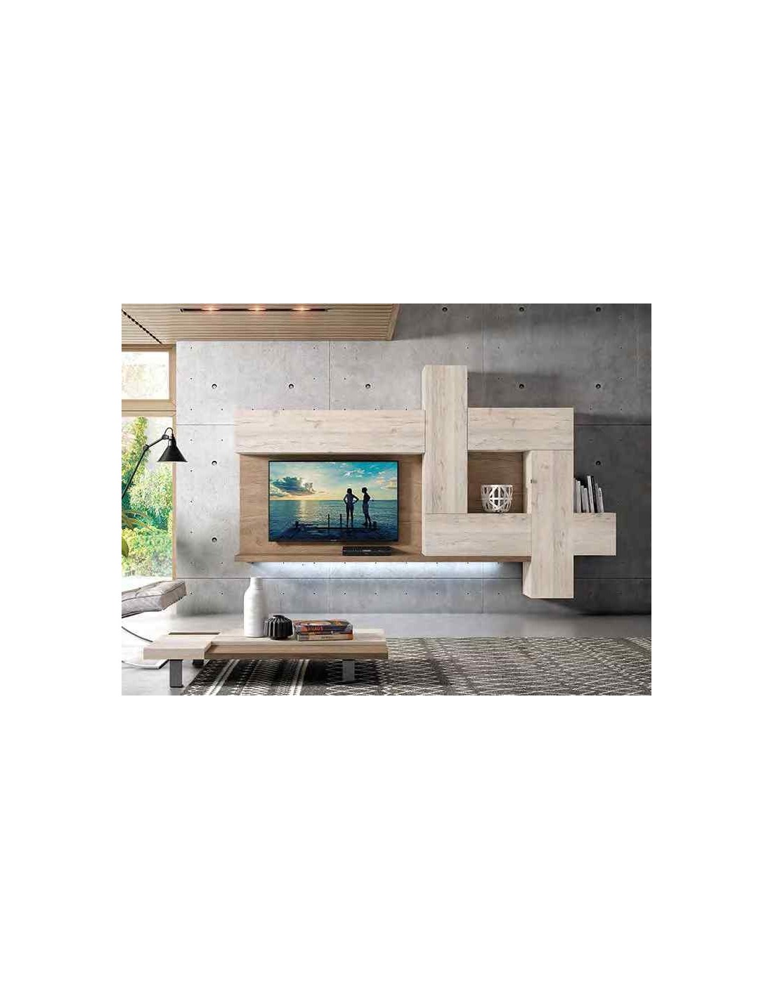 Muebles de salon diseño moderno colgados en la pared formas rectas con cirstales luces led con mesas y aparador (136)