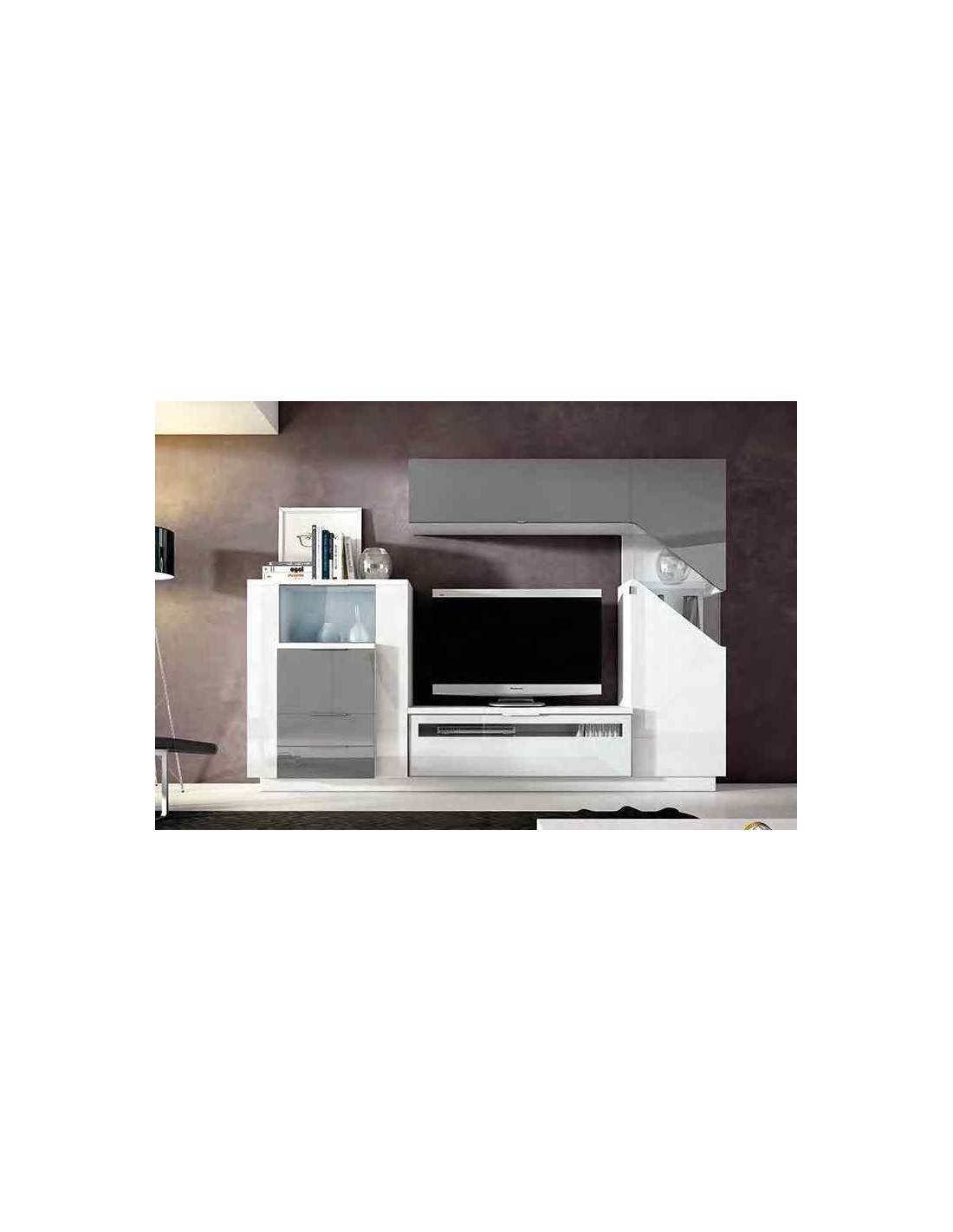 Muebles de salon diseño moderno colgados en la pared formas rectas con cirstales luces led con mesas y aparador (139)