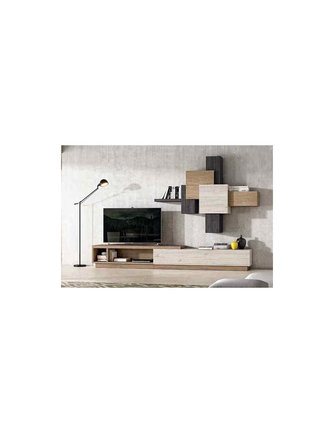 Muebles de salon diseño moderno colgados en la pared formas rectas con cirstales luces led con mesas y aparador (144)