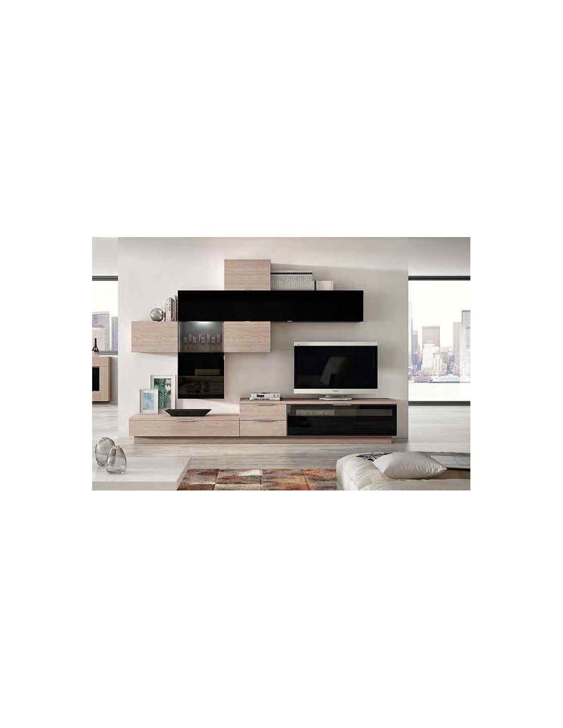 Muebles de salon diseño moderno colgados en la pared formas rectas con cirstales luces led con mesas y aparador (93)