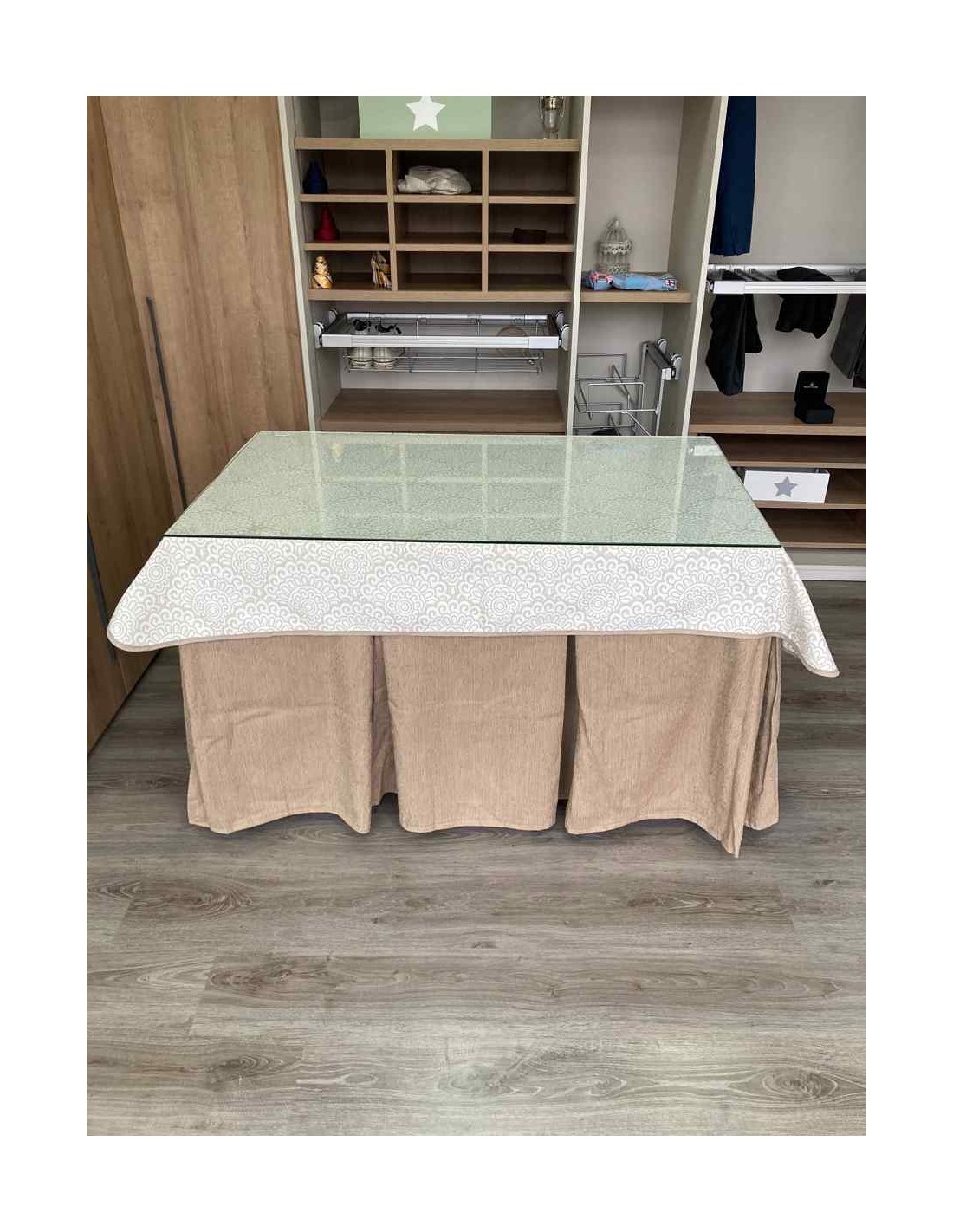 Confeccionada con 8 pliegues para mantener el calor de manera eficiente. Las tablas comunmente llamados pliegues, favorecen la retención de la temperatura impidiendo escapar el calor cuando nos sentamos en la mesa y nos cubrimos con ella. Gracias a nuestro diseño en los fuelles la falda de mesa camilla caerá cubriéndono los laterales e impidiendo que escape el calor.