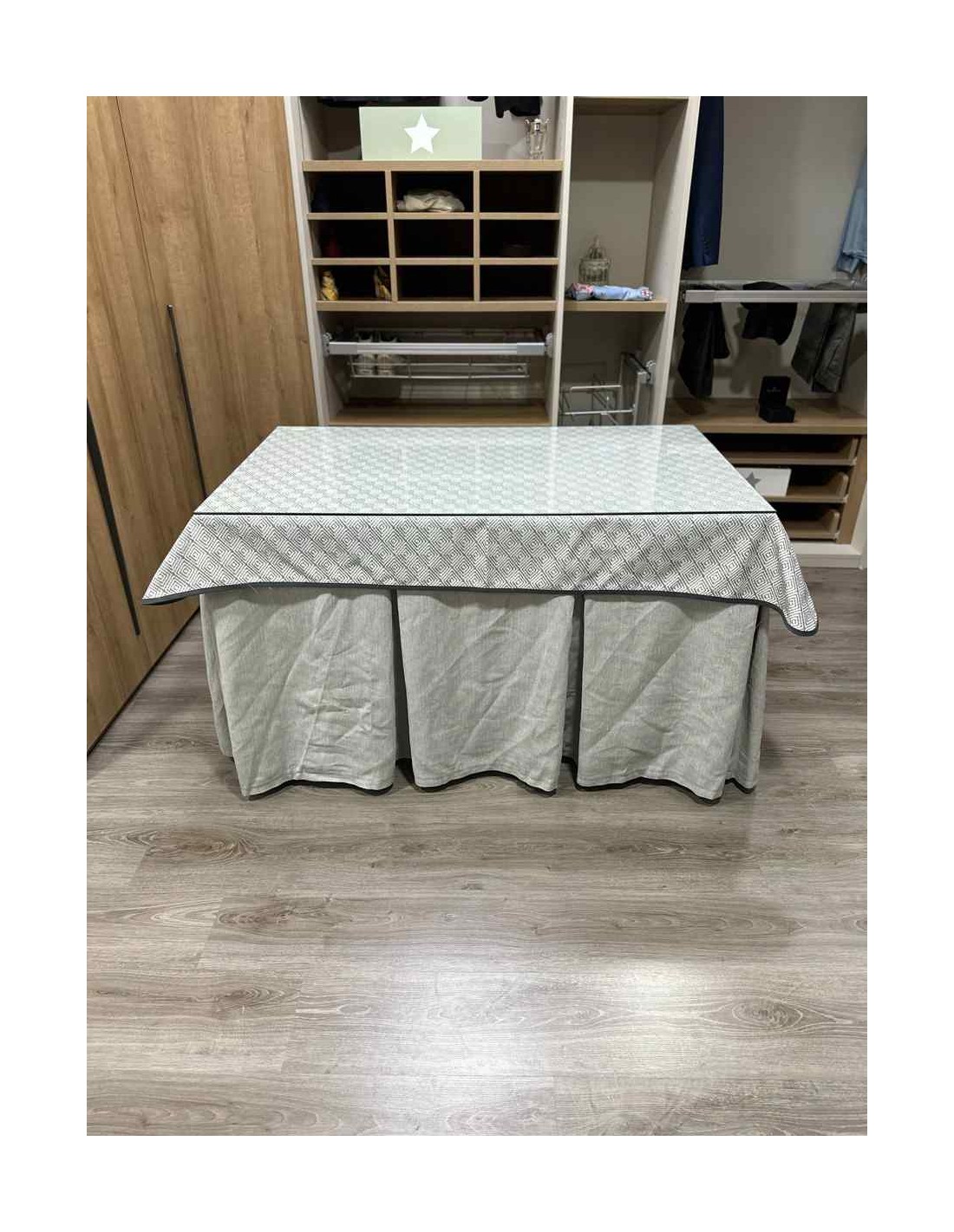 Confeccionada con 8 pliegues para mantener el calor de manera eficiente. Las tablas comunmente llamados pliegues, favorecen la retención de la temperatura impidiendo escapar el calor cuando nos sentamos en la mesa y nos cubrimos con ella. Gracias a nuestro diseño en los fuelles la falda de mesa camilla caerá cubriéndono los laterales e impidiendo que escape el calor.