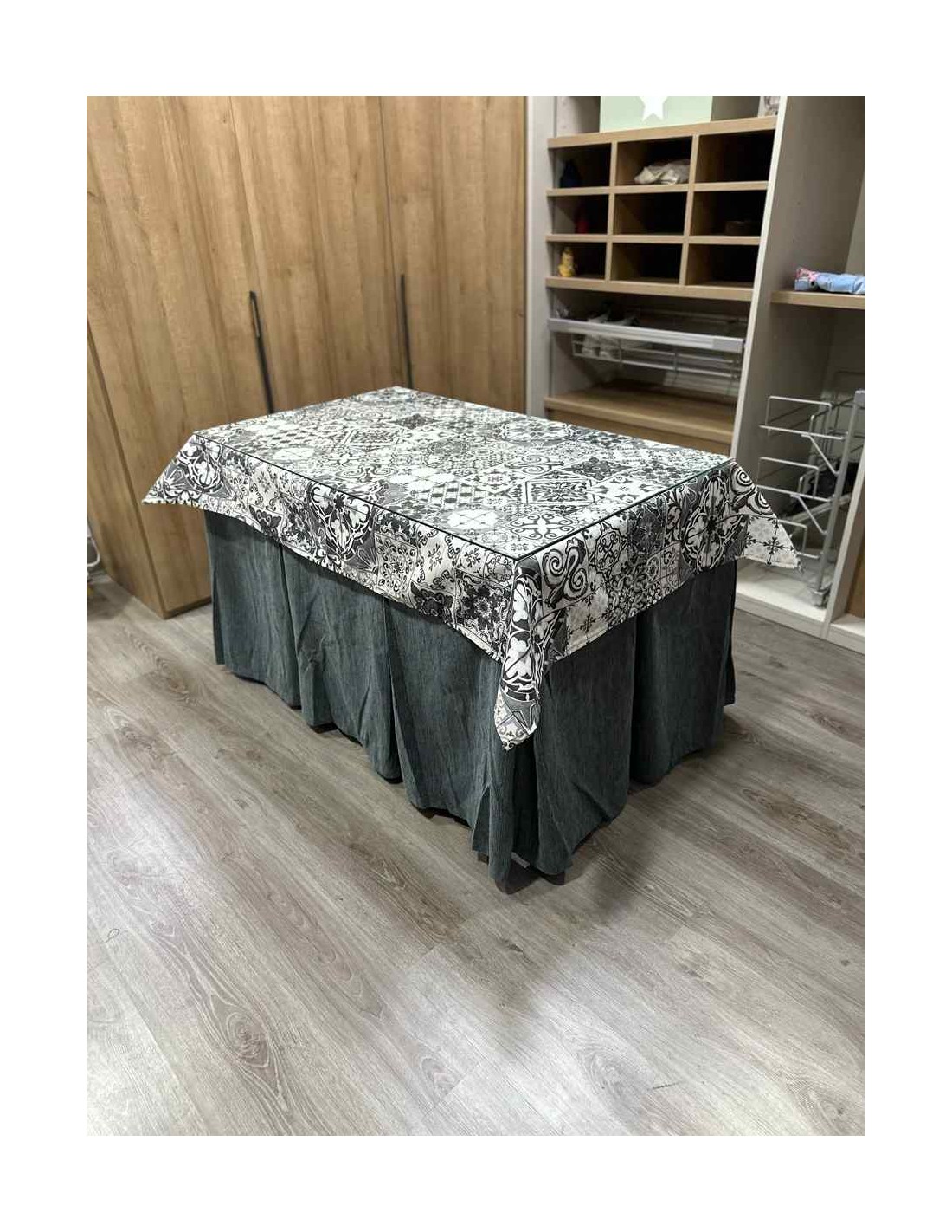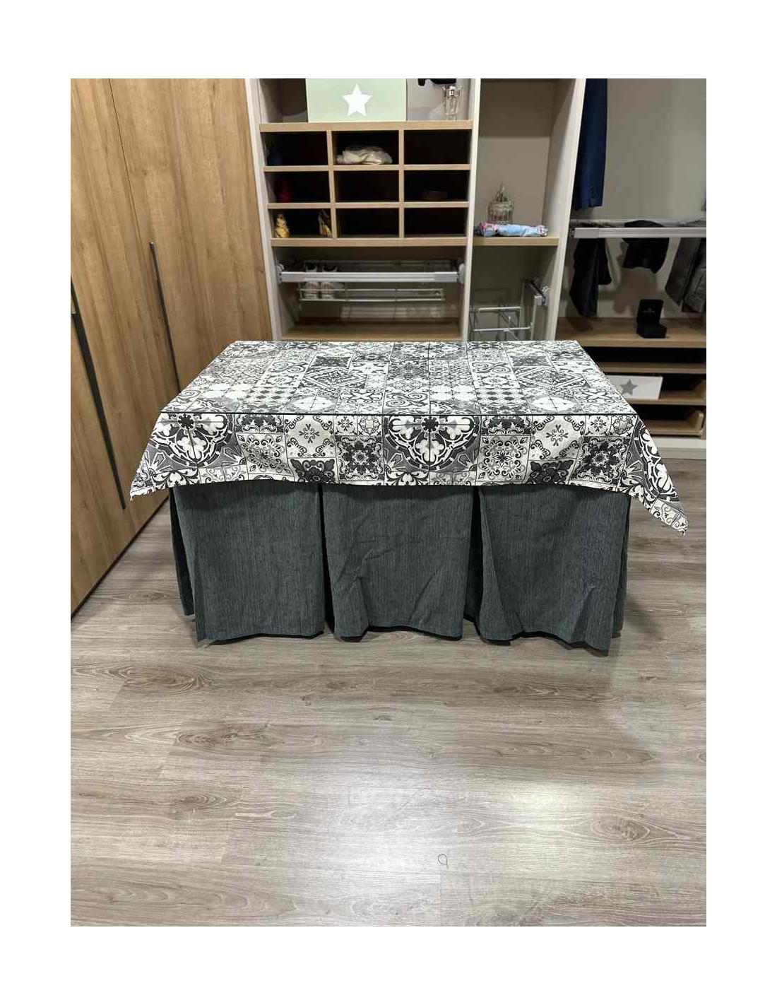 Confeccionada con 8 pliegues para mantener el calor de manera eficiente. Las tablas comunmente llamados pliegues, favorecen la retención de la temperatura impidiendo escapar el calor cuando nos sentamos en la mesa y nos cubrimos con ella. Gracias a nuestro diseño en los fuelles la falda de mesa camilla caerá cubriéndono los laterales e impidiendo que escape el calor.