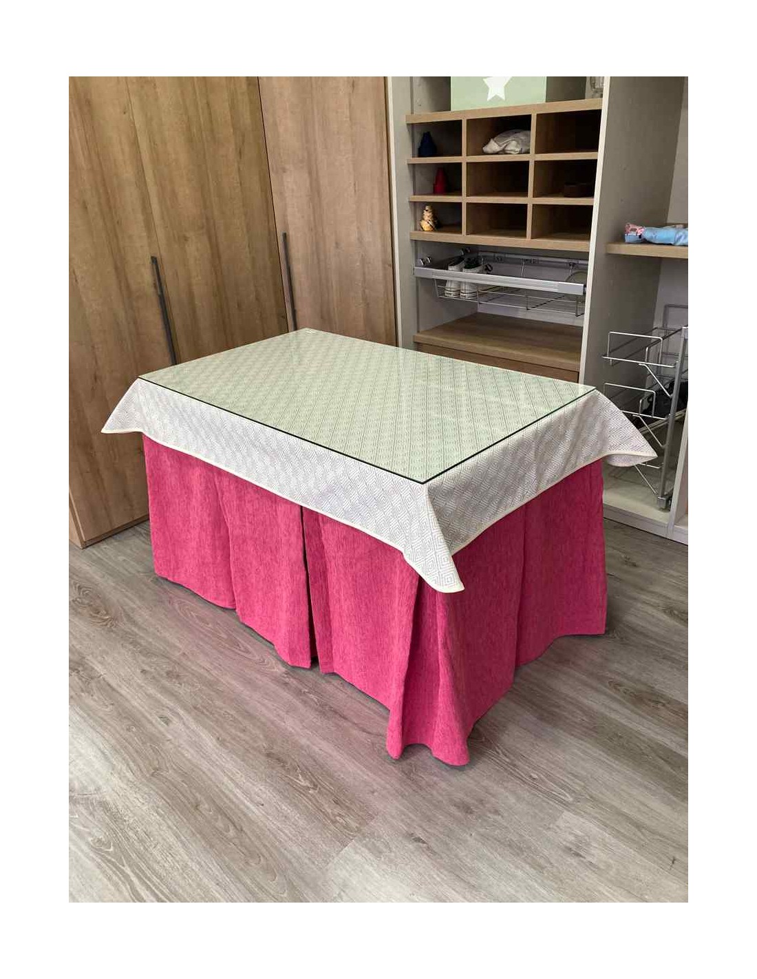 Confeccionada con 8 pliegues para mantener el calor de manera eficiente. Las tablas comunmente llamados pliegues, favorecen la retención de la temperatura impidiendo escapar el calor cuando nos sentamos en la mesa y nos cubrimos con ella. Gracias a nuestro diseño en los fuelles la falda de mesa camilla caerá cubriéndono los laterales e impidiendo que escape el calor.