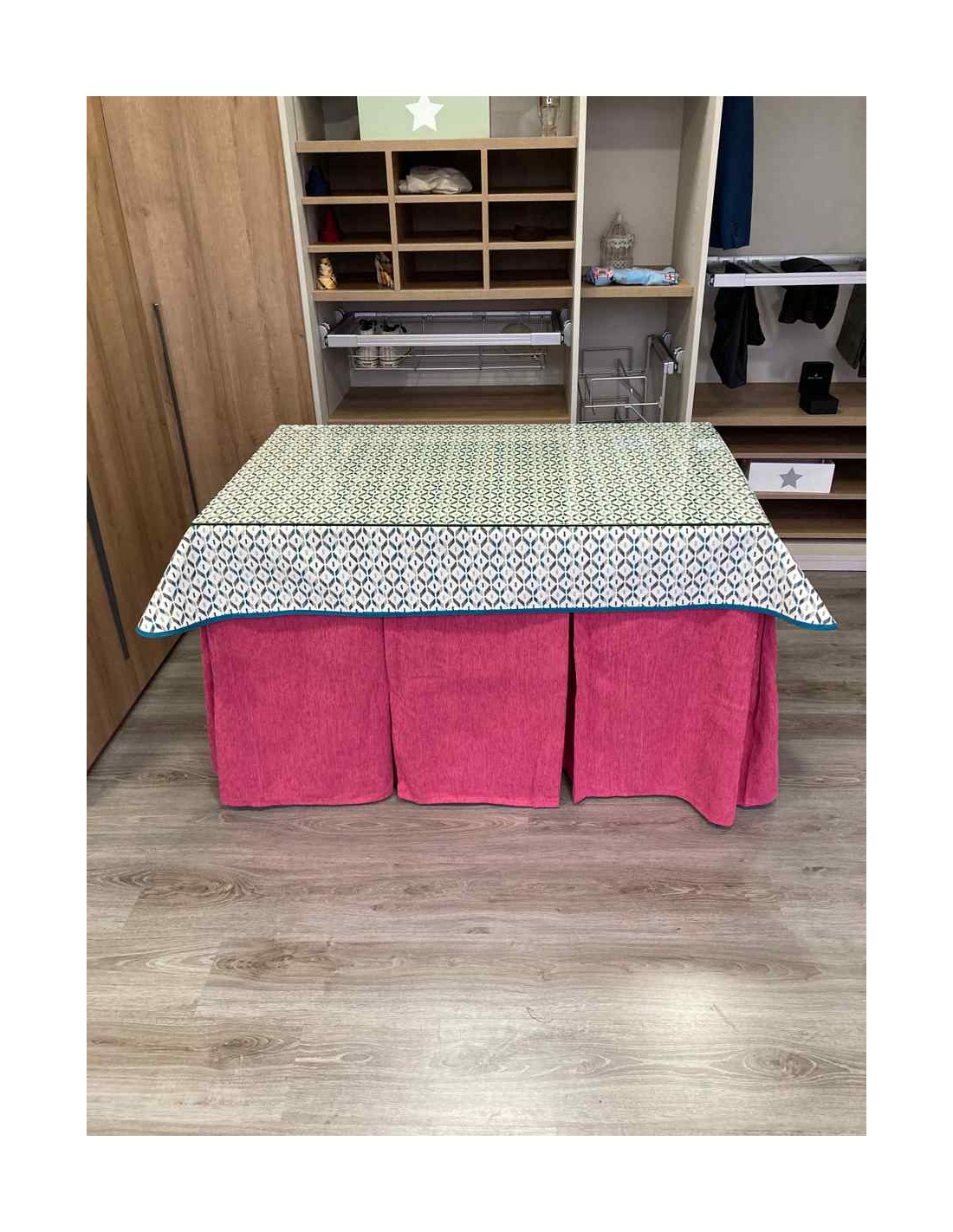 Ropa Chenilla 10 Pliegues color Rosa Chicle con Tapete Geo