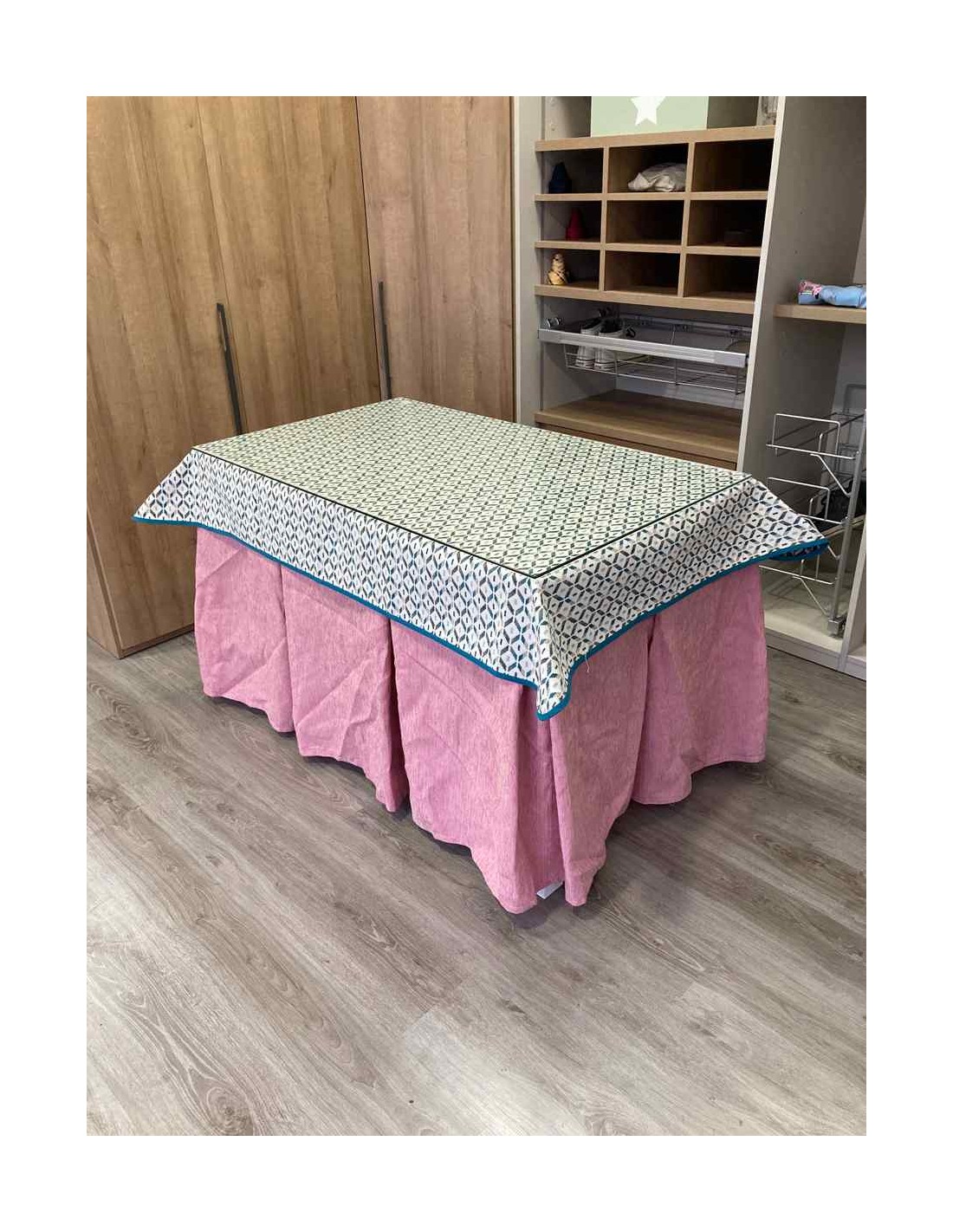 Confeccionada con 8 pliegues para mantener el calor de manera eficiente. Las tablas comunmente llamados pliegues, favorecen la retención de la temperatura impidiendo escapar el calor cuando nos sentamos en la mesa y nos cubrimos con ella. Gracias a nuestro diseño en los fuelles la falda de mesa camilla caerá cubriéndono los laterales e impidiendo que escape el calor.