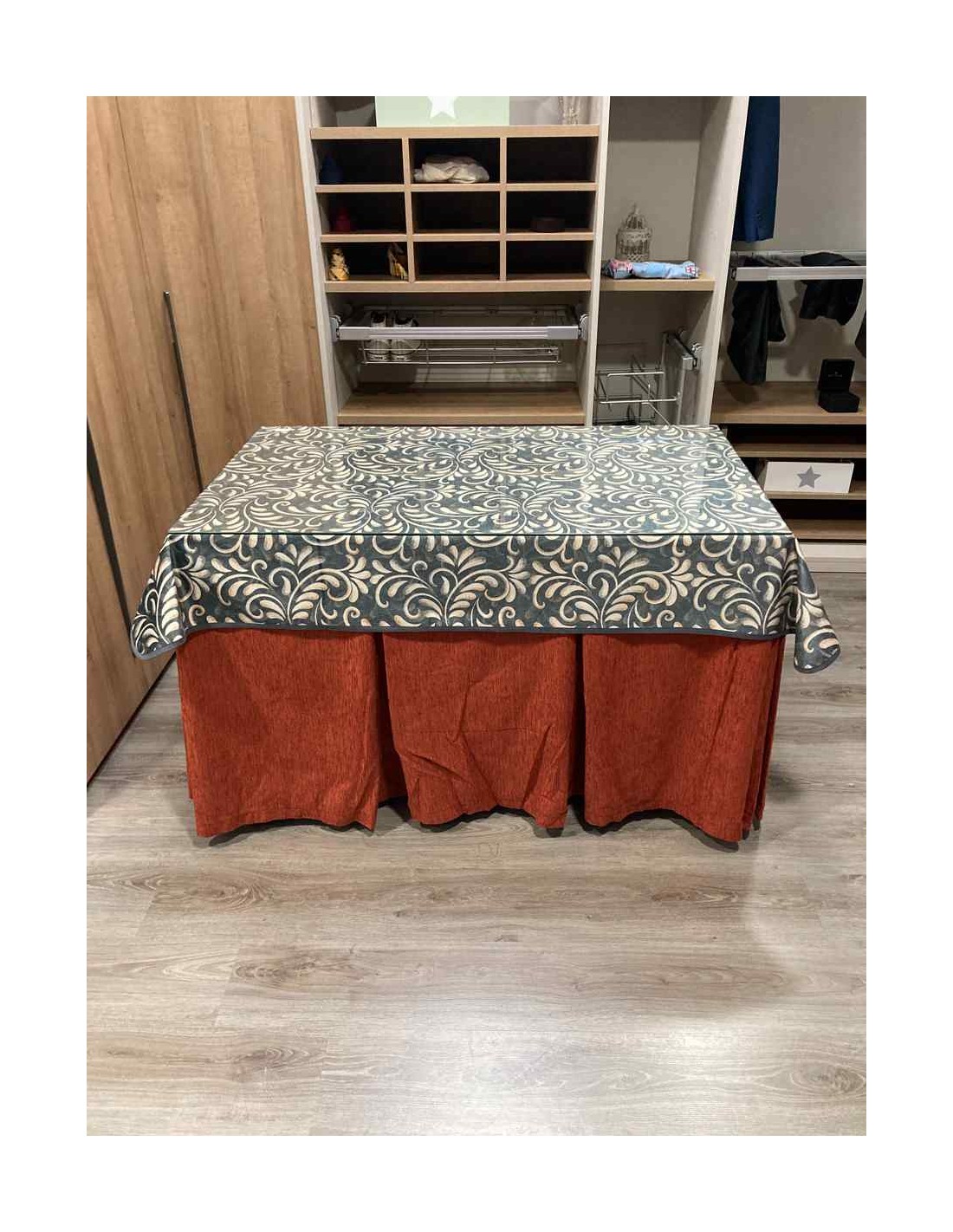 Confeccionada con 8 pliegues para mantener el calor de manera eficiente. Las tablas comunmente llamados pliegues, favorecen la retención de la temperatura impidiendo escapar el calor cuando nos sentamos en la mesa y nos cubrimos con ella. Gracias a nuestro diseño en los fuelles la falda de mesa camilla caerá cubriéndono los laterales e impidiendo que escape el calor.