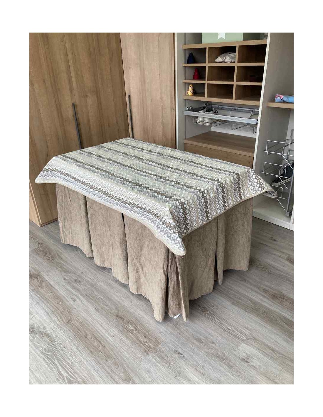 Confeccionada con 8 pliegues para mantener el calor de manera eficiente. Las tablas comunmente llamados pliegues, favorecen la retención de la temperatura impidiendo escapar el calor cuando nos sentamos en la mesa y nos cubrimos con ella. Gracias a nuestro diseño en los fuelles la falda de mesa camilla caerá cubriéndono los laterales e impidiendo que escape el calor.