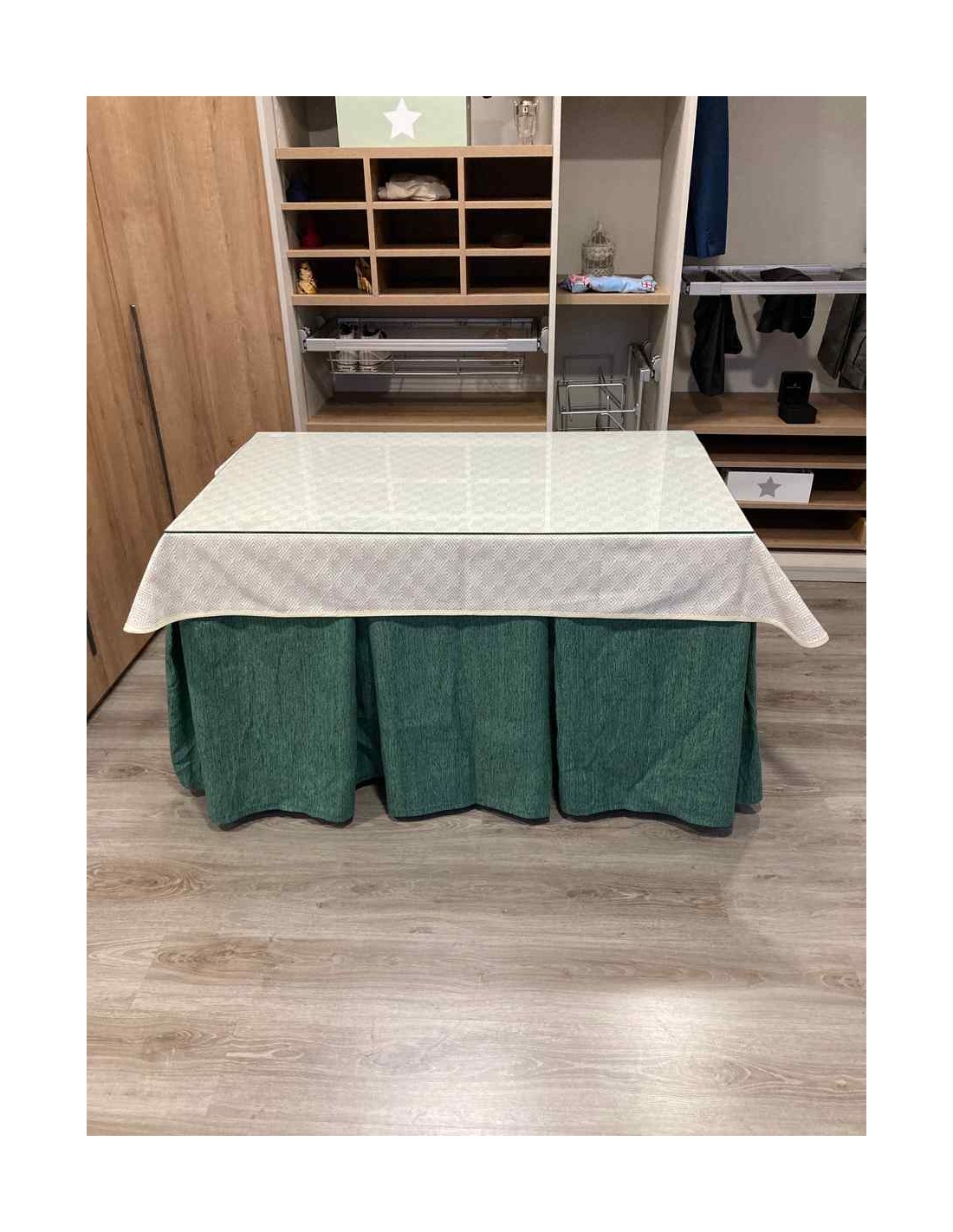Confeccionada con 8 pliegues para mantener el calor de manera eficiente. Las tablas comunmente llamados pliegues, favorecen la retención de la temperatura impidiendo escapar el calor cuando nos sentamos en la mesa y nos cubrimos con ella. Gracias a nuestro diseño en los fuelles la falda de mesa camilla caerá cubriéndono los laterales e impidiendo que escape el calor.