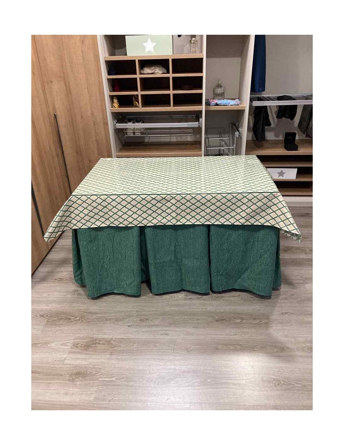 Confeccionada con 8 pliegues para mantener el calor de manera eficiente. Las tablas comunmente llamados pliegues, favorecen la retención de la temperatura impidiendo escapar el calor cuando nos sentamos en la mesa y nos cubrimos con ella. Gracias a nuestro diseño en los fuelles la falda de mesa camilla caerá cubriéndono los laterales e impidiendo que escape el calor.