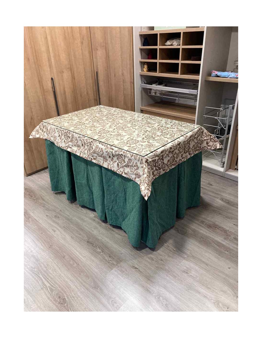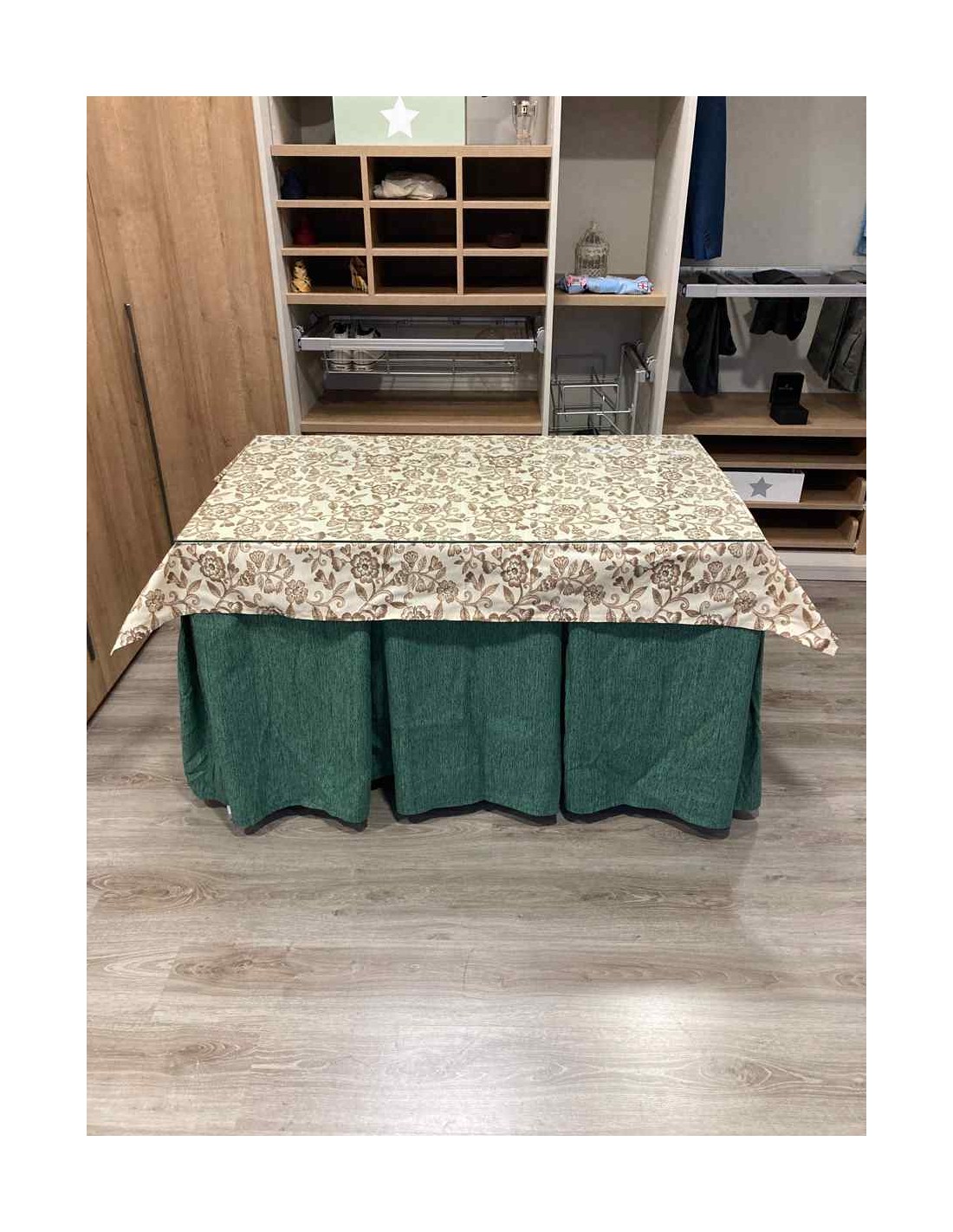 Confeccionada con 8 pliegues para mantener el calor de manera eficiente. Las tablas comunmente llamados pliegues, favorecen la retención de la temperatura impidiendo escapar el calor cuando nos sentamos en la mesa y nos cubrimos con ella. Gracias a nuestro diseño en los fuelles la falda de mesa camilla caerá cubriéndono los laterales e impidiendo que escape el calor.