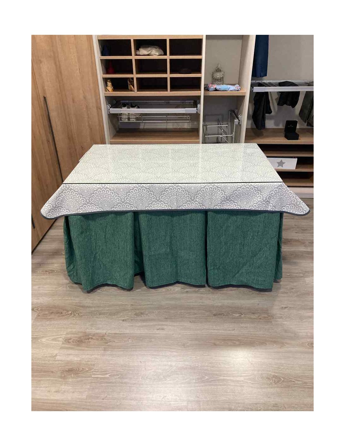 Confeccionada con 8 pliegues para mantener el calor de manera eficiente. Las tablas comunmente llamados pliegues, favorecen la retención de la temperatura impidiendo escapar el calor cuando nos sentamos en la mesa y nos cubrimos con ella. Gracias a nuestro diseño en los fuelles la falda de mesa camilla caerá cubriéndono los laterales e impidiendo que escape el calor.