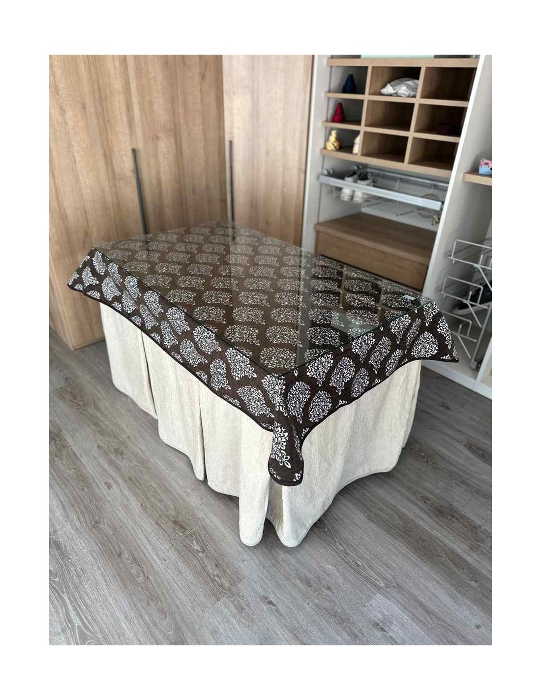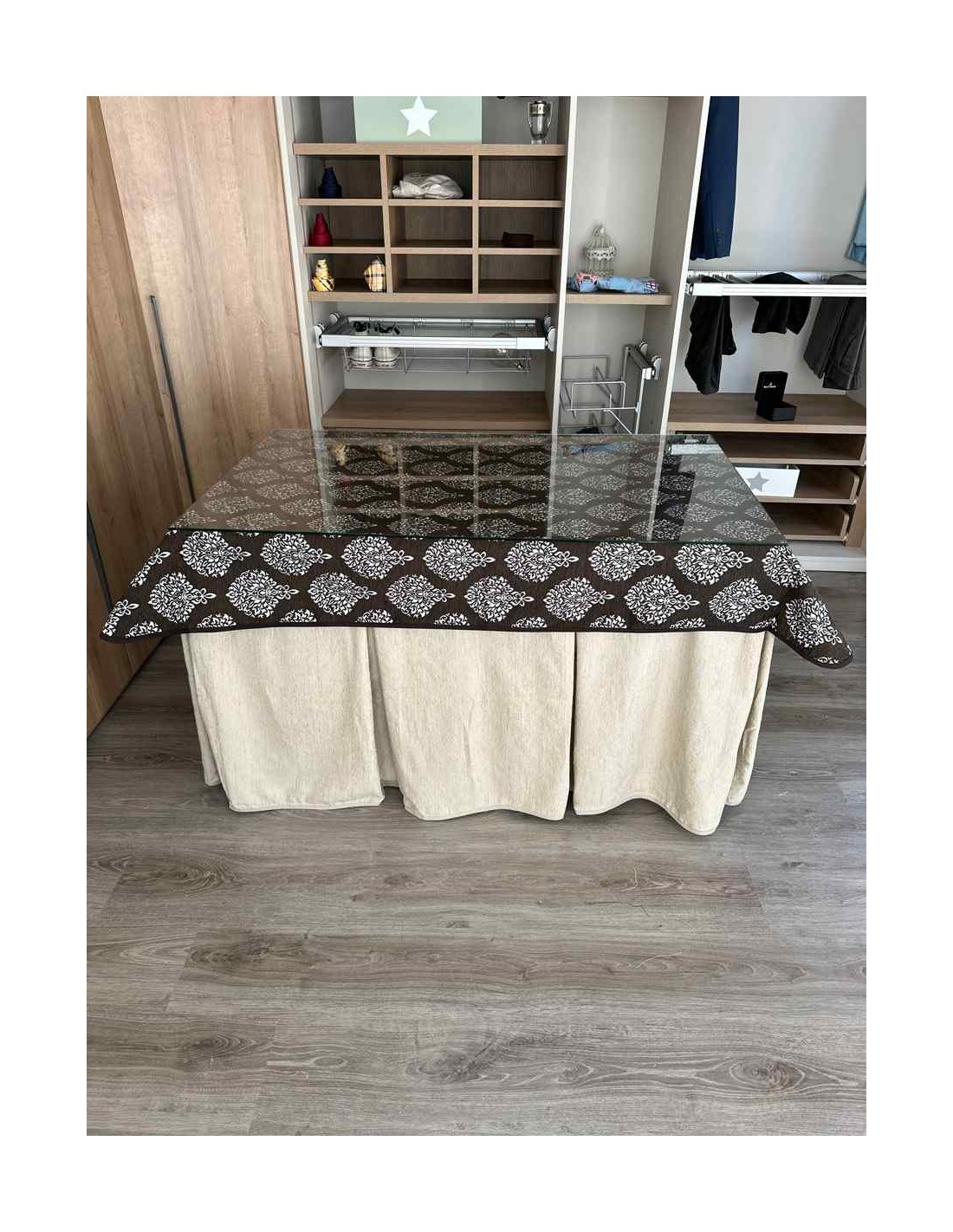 Confeccionada con 8 pliegues para mantener el calor de manera eficiente. Las tablas comunmente llamados pliegues, favorecen la retención de la temperatura impidiendo escapar el calor cuando nos sentamos en la mesa y nos cubrimos con ella. Gracias a nuestro diseño en los fuelles la falda de mesa camilla caerá cubriéndono los laterales e impidiendo que escape el calor.