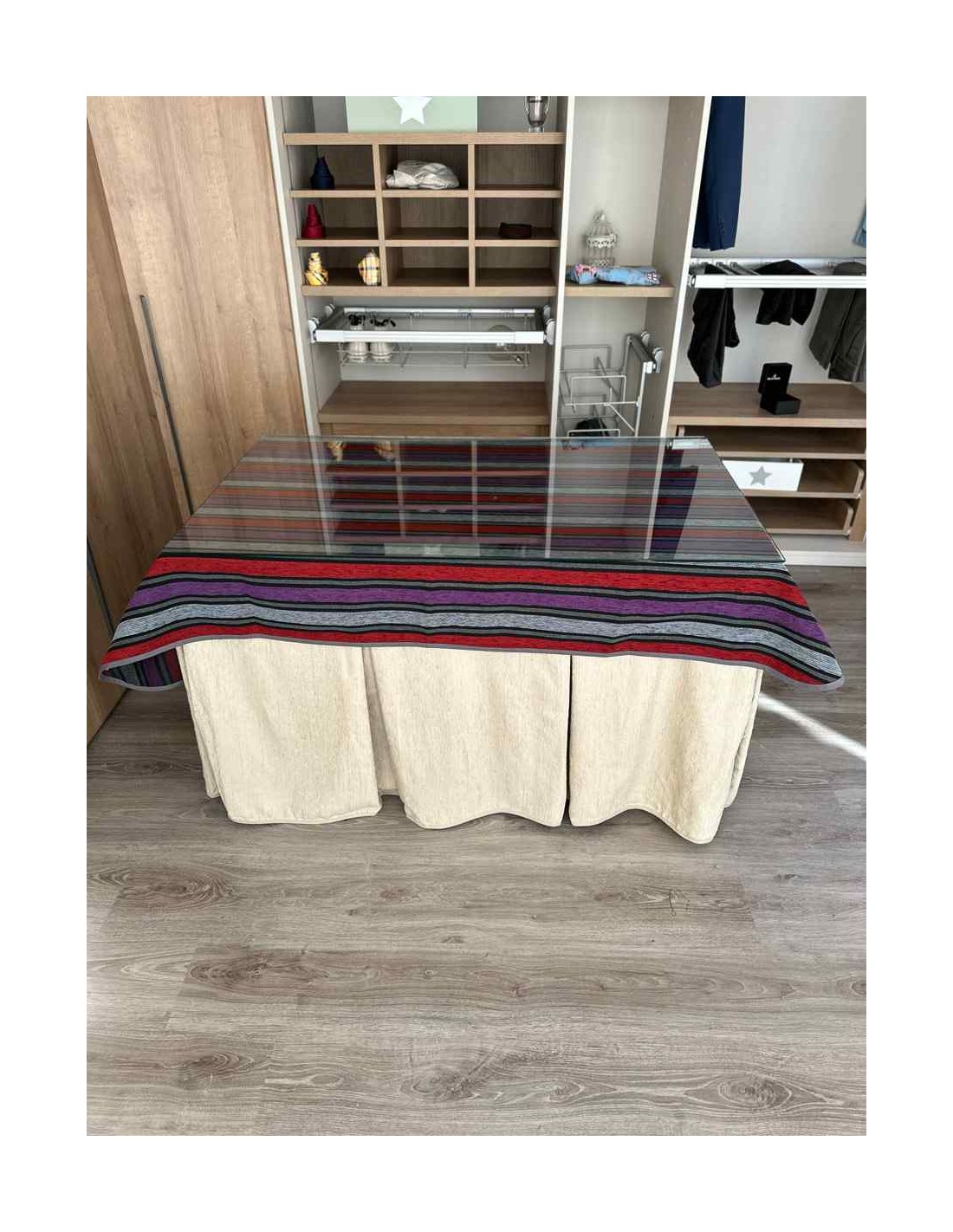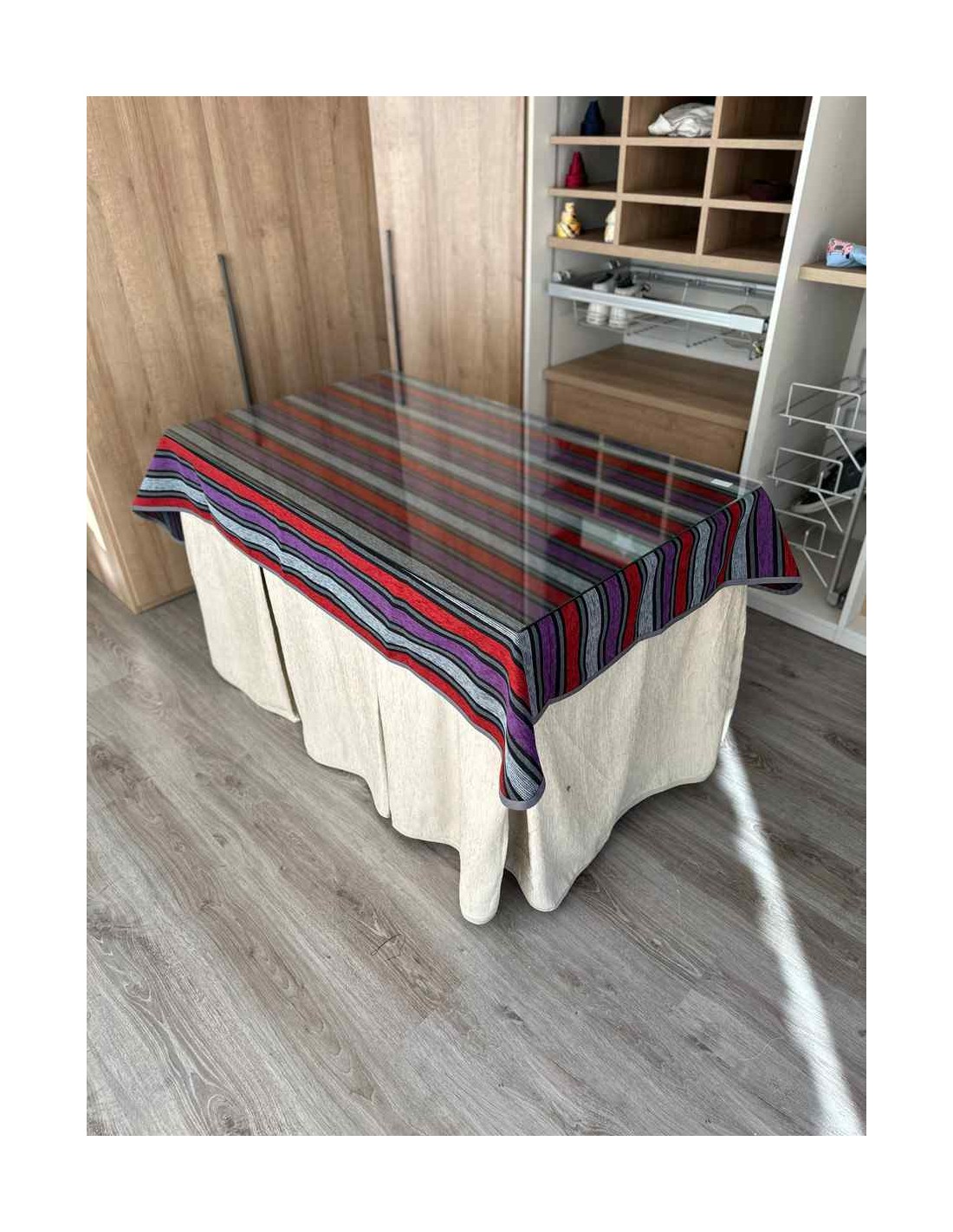 Confeccionada con 8 pliegues para mantener el calor de manera eficiente. Las tablas comunmente llamados pliegues, favorecen la retención de la temperatura impidiendo escapar el calor cuando nos sentamos en la mesa y nos cubrimos con ella. Gracias a nuestro diseño en los fuelles la falda de mesa camilla caerá cubriéndono los laterales e impidiendo que escape el calor.