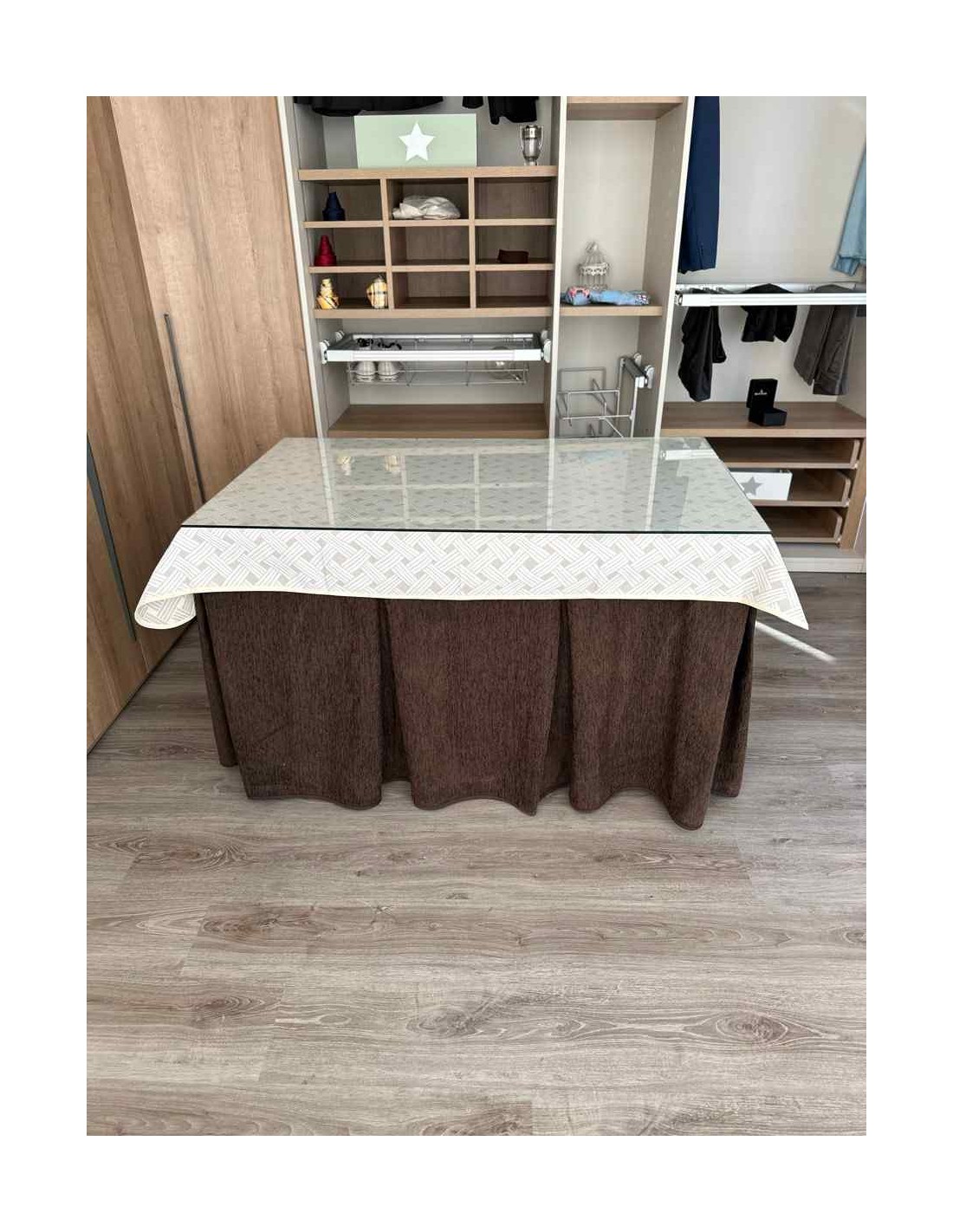 Confeccionada con 8 pliegues para mantener el calor de manera eficiente. Las tablas comunmente llamados pliegues, favorecen la retención de la temperatura impidiendo escapar el calor cuando nos sentamos en la mesa y nos cubrimos con ella. Gracias a nuestro diseño en los fuelles la falda de mesa camilla caerá cubriéndono los laterales e impidiendo que escape el calor.