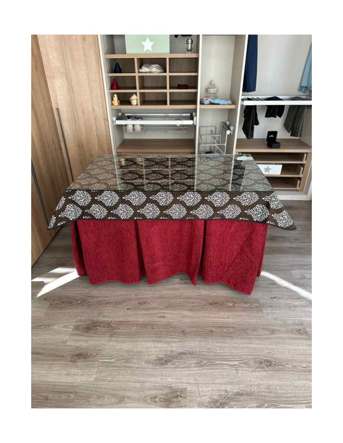 Confeccionada con 8 pliegues para mantener el calor de manera eficiente. Las tablas comunmente llamados pliegues, favorecen la retención de la temperatura impidiendo escapar el calor cuando nos sentamos en la mesa y nos cubrimos con ella. Gracias a nuestro diseño en los fuelles la falda de mesa camilla caerá cubriéndono los laterales e impidiendo que escape el calor.